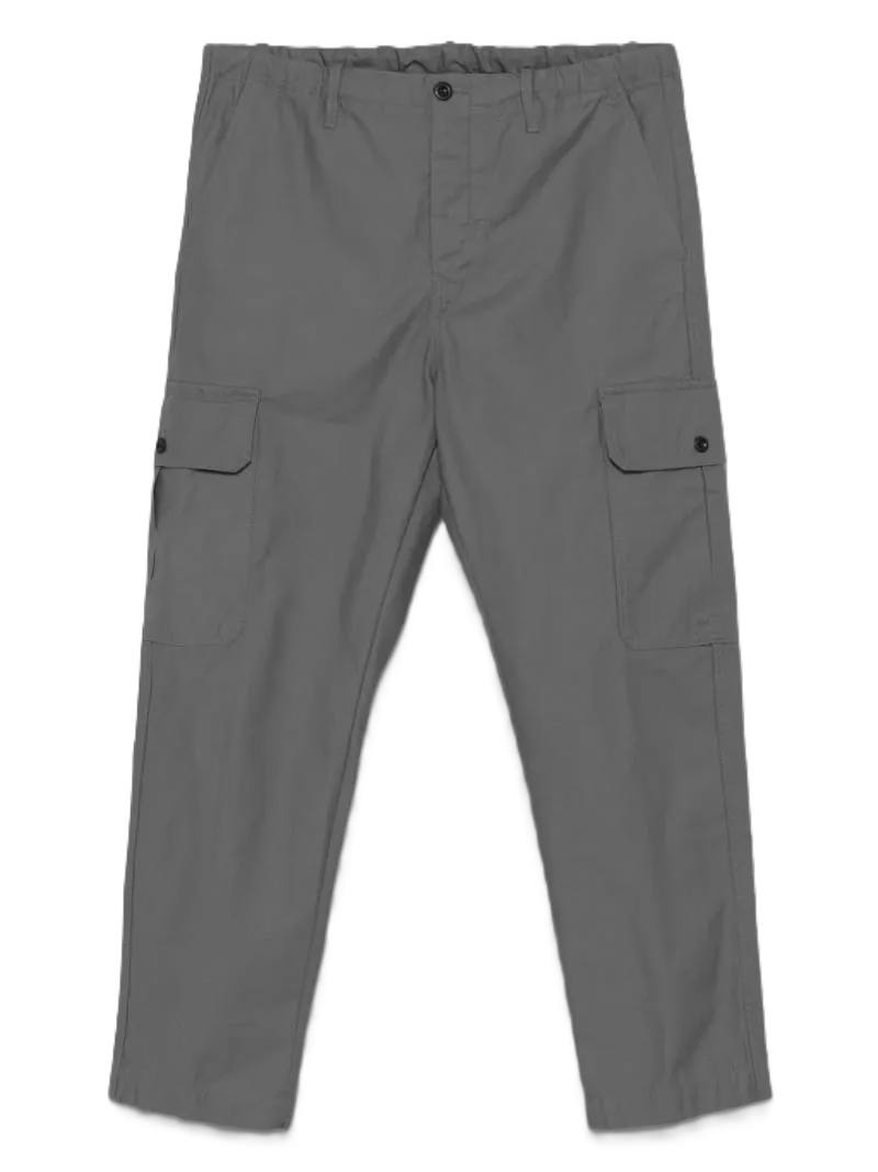 Chiusura con bottoni. Due tasche diagonali ai lati. Due tasche cargo laterali. Due tasche posteriori con patta.