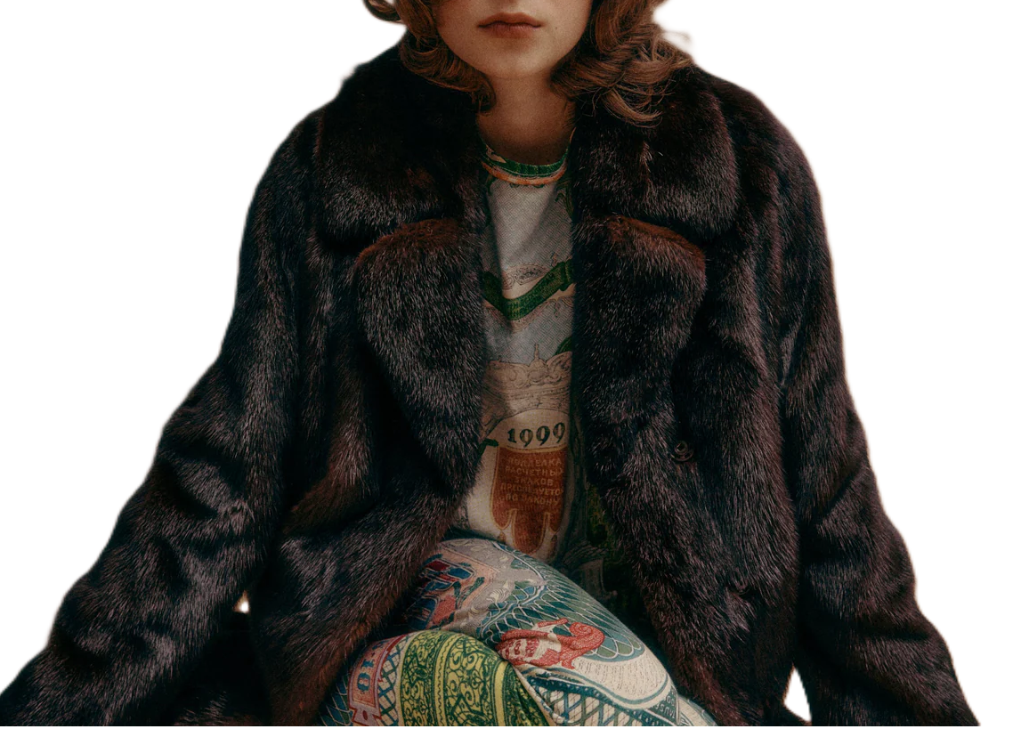 Giacca classica a trapezio con spalle morbide, realizzata in visone marrone scuro e dal taglio rilassato. Tasche laterali nascoste, coulisse interna e chiusura a scatto.