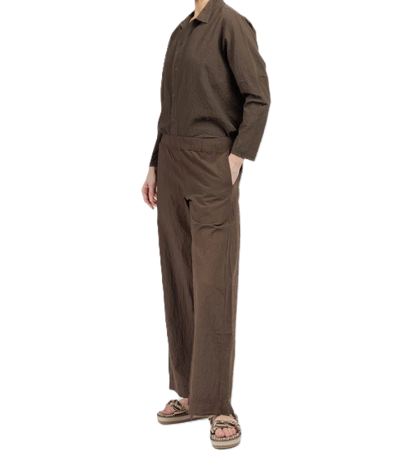 Pantalone gamba larga, tasche laterali, vestibilità comoda, elastico in vita. Prodotto in Italia.