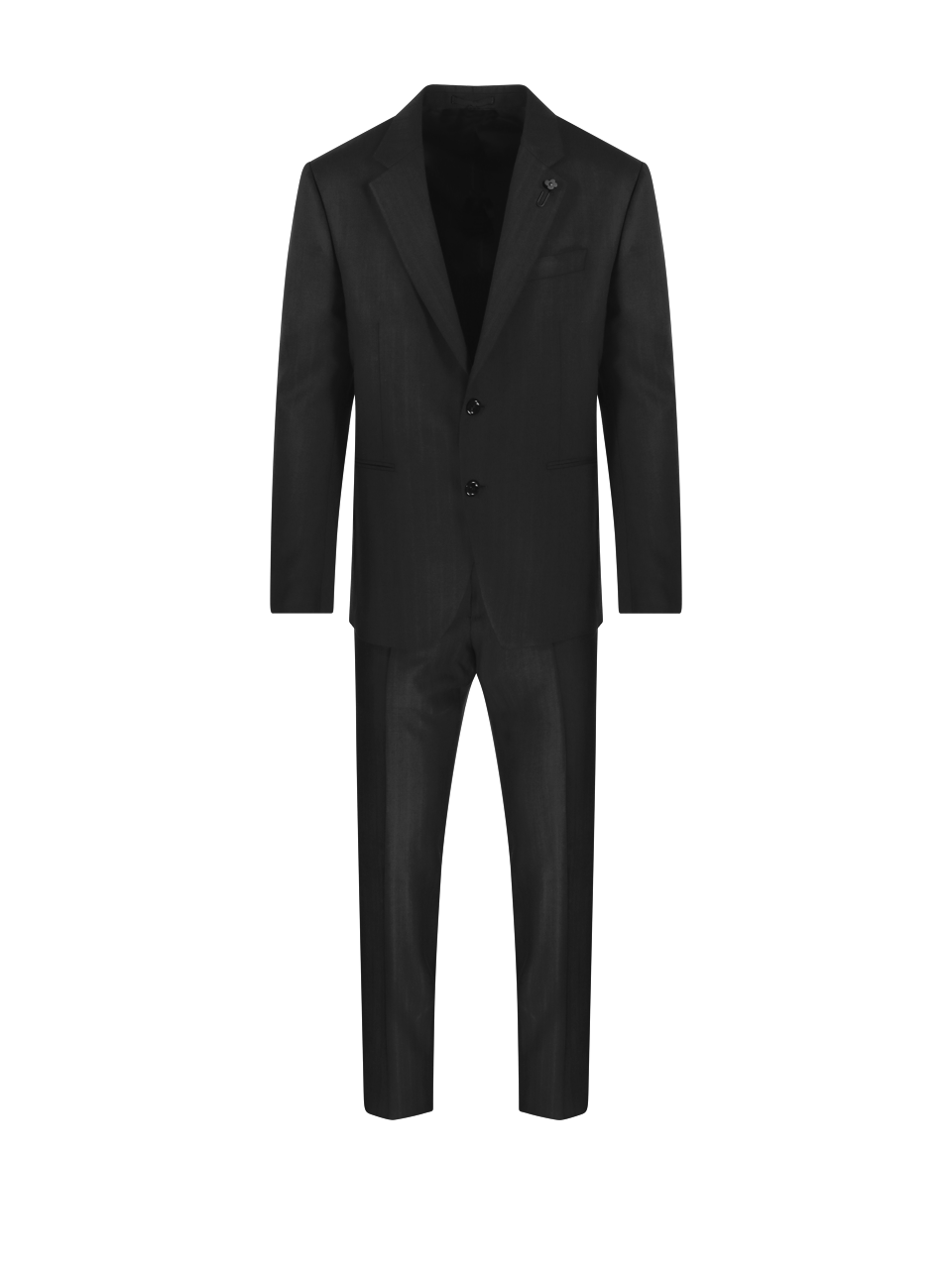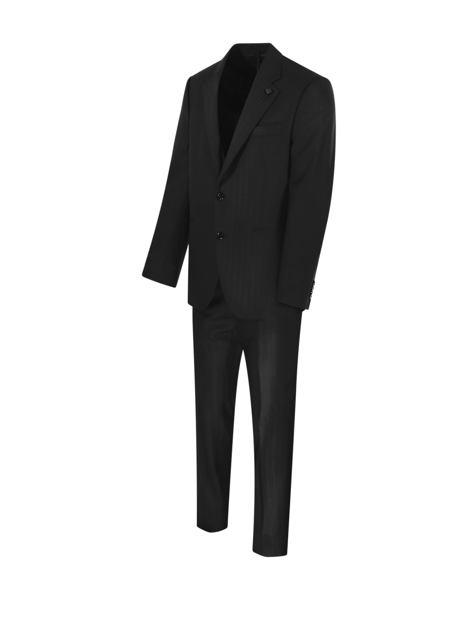 Abito "Roma" in twill di lana vergine di Lardini, con giacca doppiopetto, collo revers e tasche laterali applicate, pantalone con passanti e tasche laterali e posteriori a filetto.