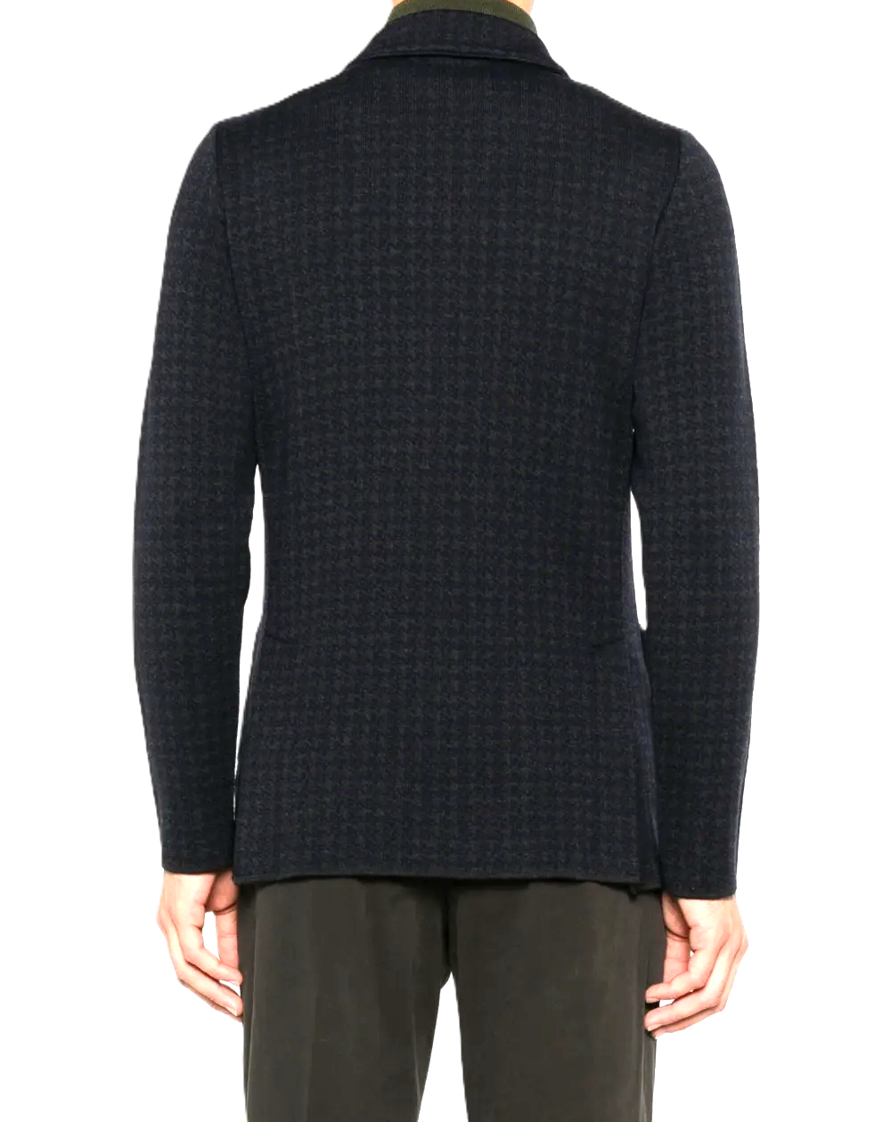 Giacca maglia grigio e blu, fantasia pied-de-poule, chiusura doppiopetto, tasche applicate, dettaglio con bottoni
