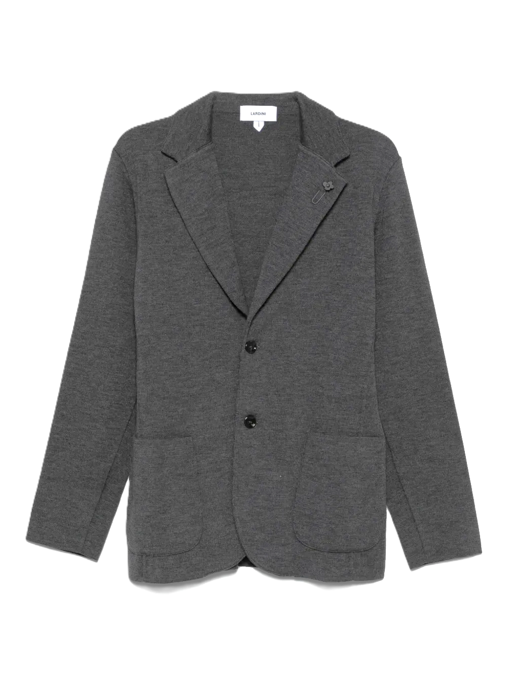 Giacca maglia grigia, tasche applicate, revers a punta, chiusura con bottoni, maniche lunghe