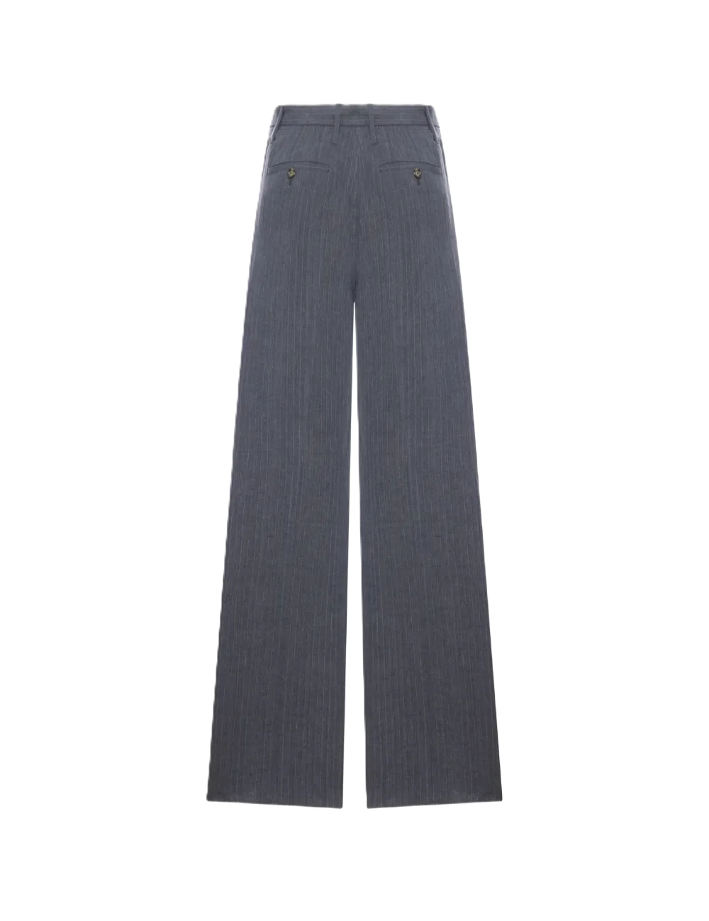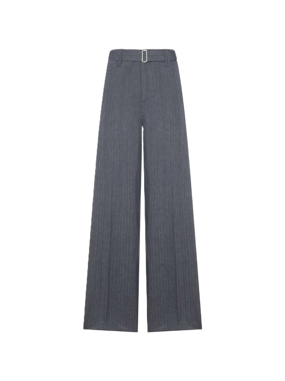 Pantalone con passanti per cintura in lino blu/grigio, fibbia in metallo, tasche posteriori a filetto, piega centrale sulla gamba