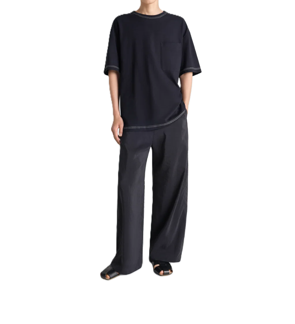 Questa t-shirt a maniche corte dal design squadrato è un nuovo capo essenziale del guardaroba LEMAIRE. È realizzata in jersey di lino e cotone fluido, morbido e piacevole al tatto. La t-shirt a maniche corte presenta una tasca applicata sul petto, finiture a costine sullo scollo e due piccoli spacchi laterali.