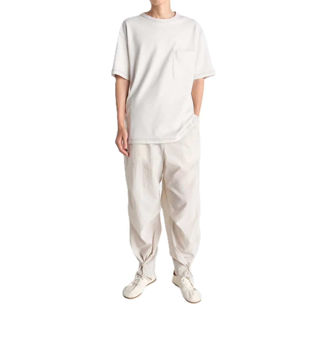 Questa t-shirt a maniche corte dal design squadrato è un nuovo capo essenziale del guardaroba LEMAIRE. È realizzata in jersey di lino e cotone fluido, morbido e piacevole al tatto. La t-shirt a maniche corte presenta una tasca applicata sul petto, finiture a costine sullo scollo e due piccoli spacchi laterali.