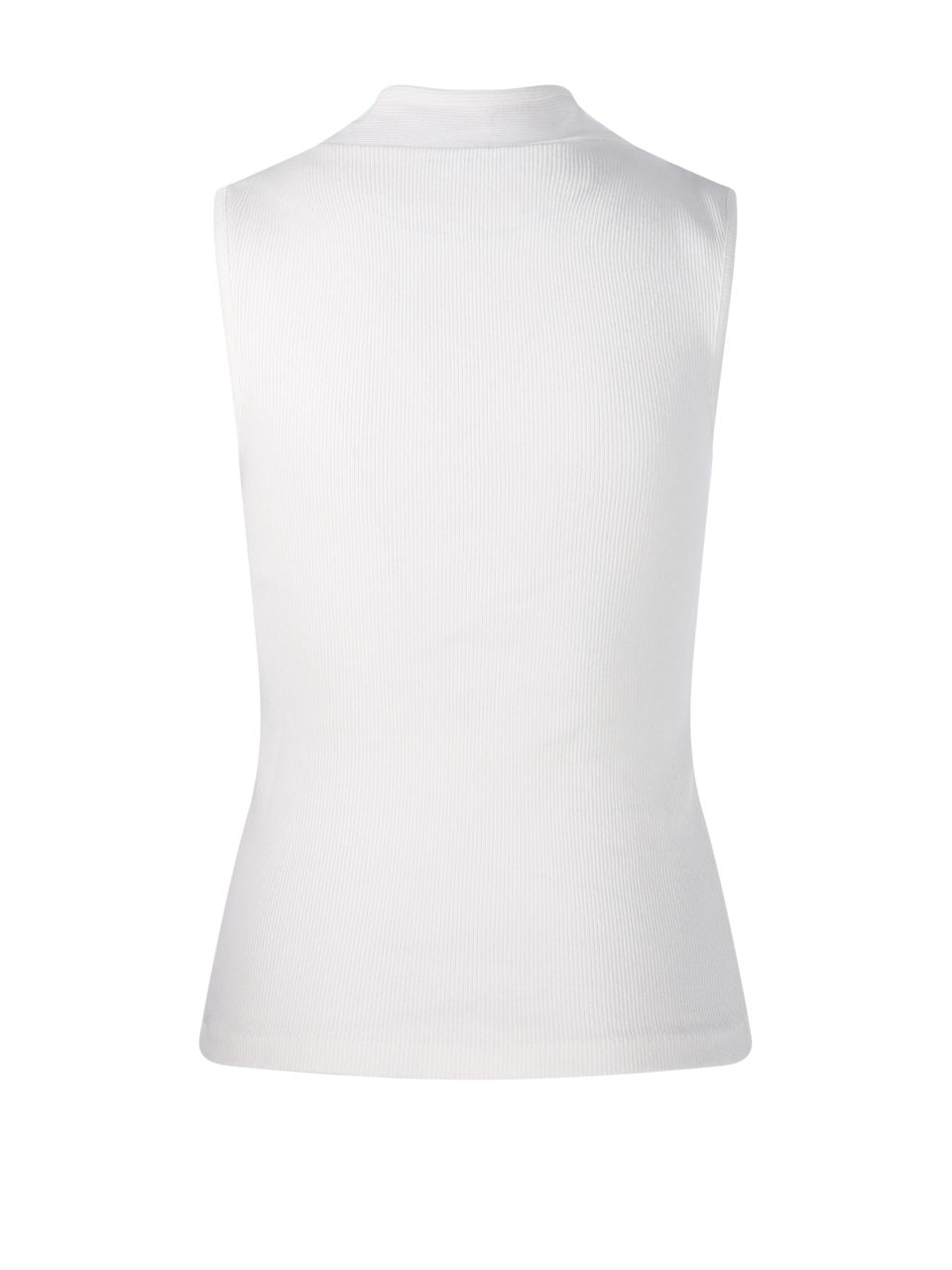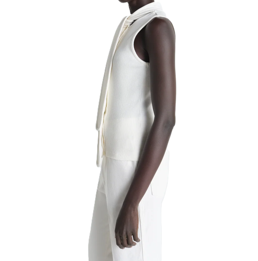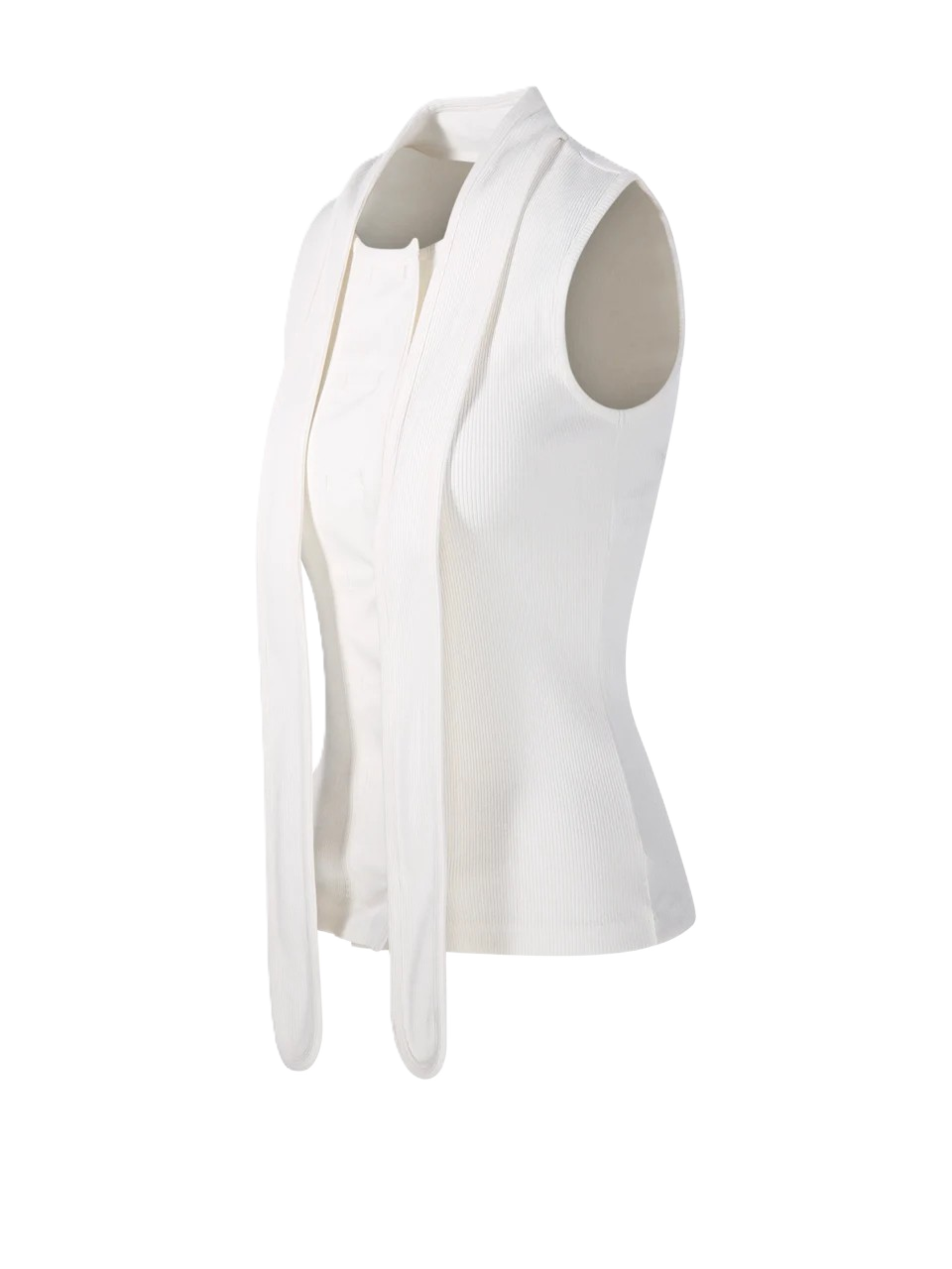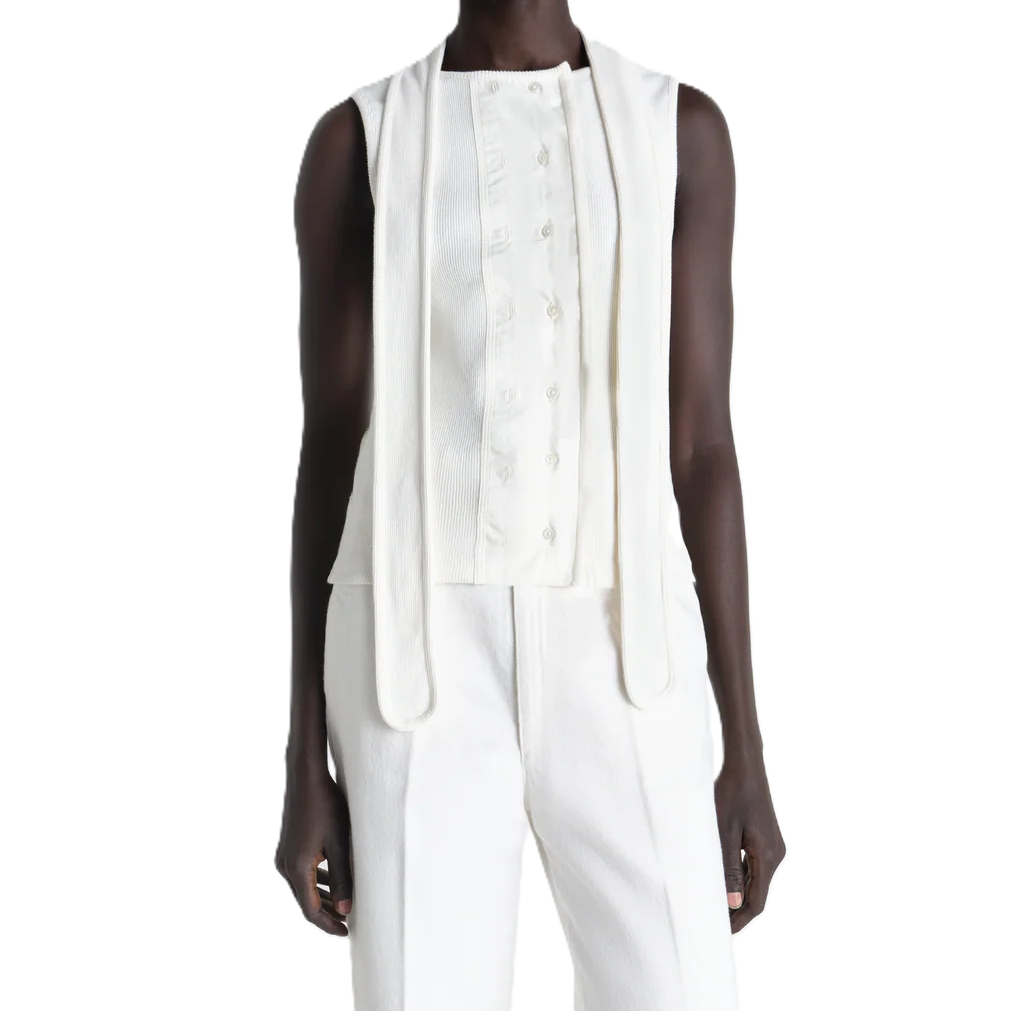 Il top aderente asimmetrico è realizzato in jersey a coste foderato in cotone, un tessuto leggero e fluido con coste testurizzate che aggiungono consistenza al capo. Questo modello senza maniche presenta una doppia abbottonatura in cotone tono su tono con bottoni in madreperla e presenta molteplici dettagli di cucitura tono su tono sulle cuciture e lungo la chiusura abbottonata. La sciarpa è integrata nella parte posteriore del collo e può essere indossata chiusa o aperta per un effetto più rilassato.