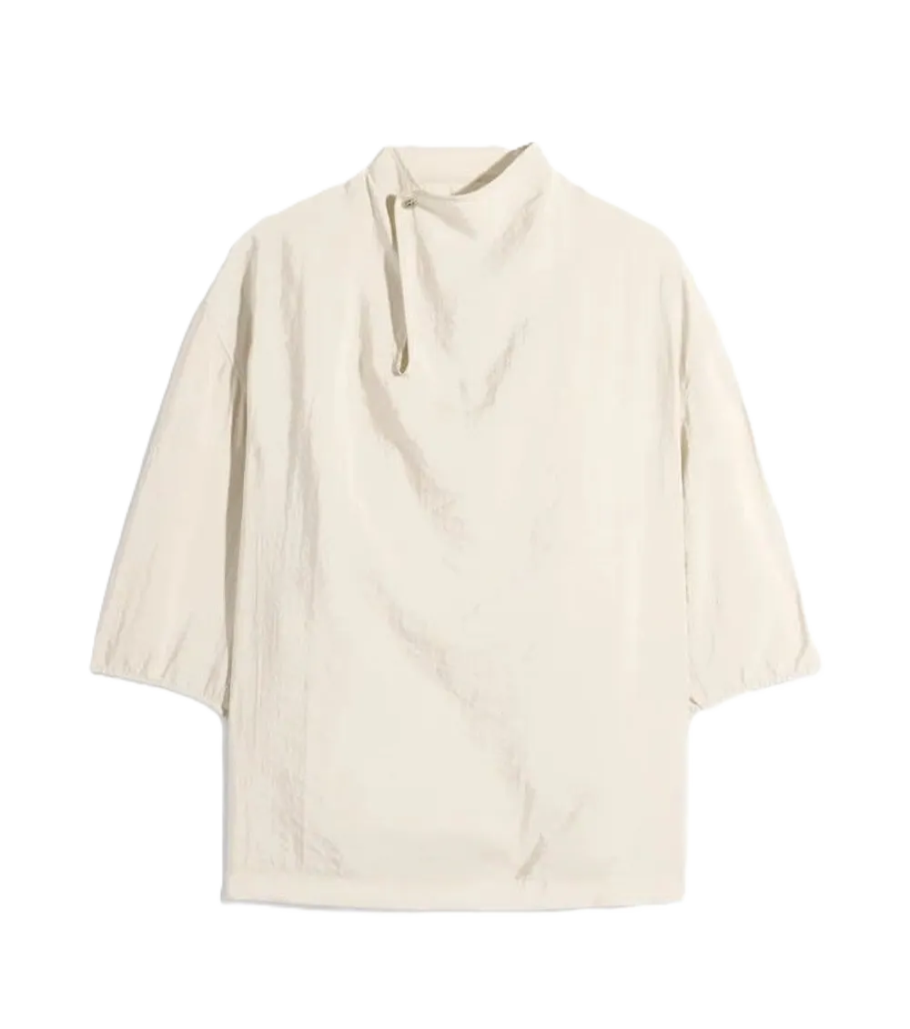 T-shirt con scollo a V, colore beige sabbia, maniche a tre quarti, dettaglio con bottoni, collo alto, orlo elasticizzato