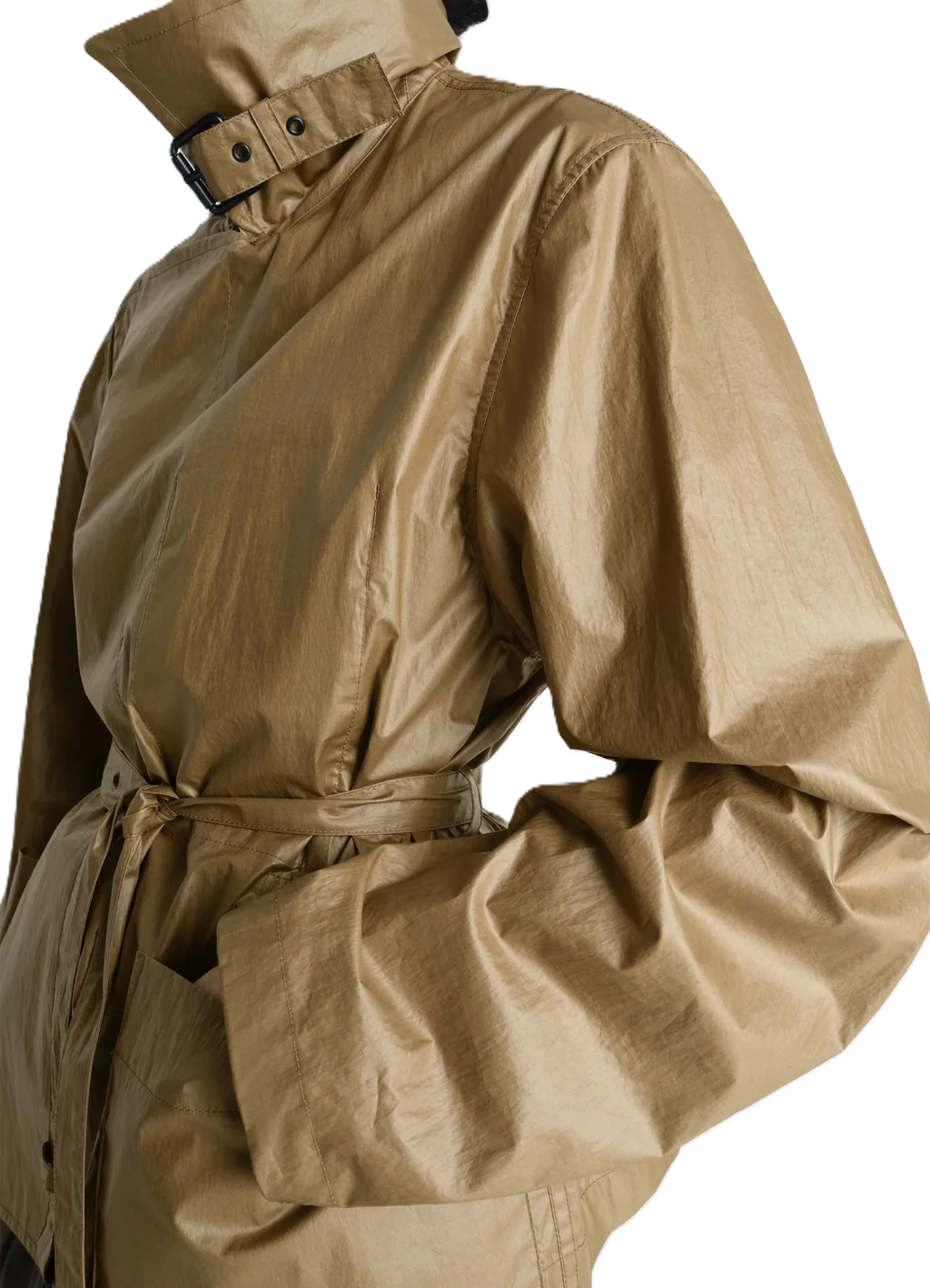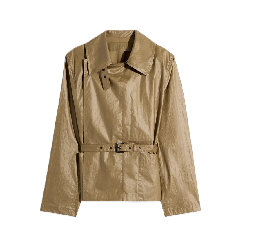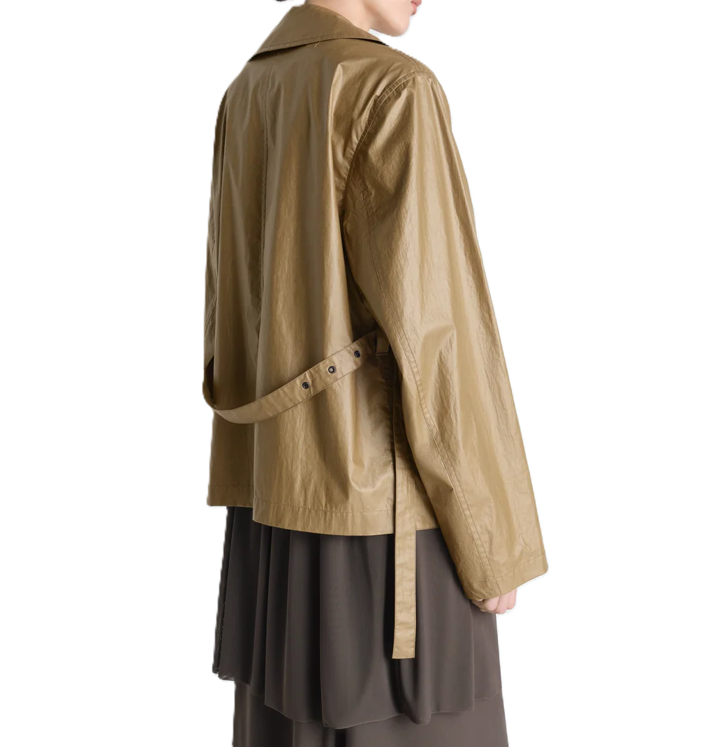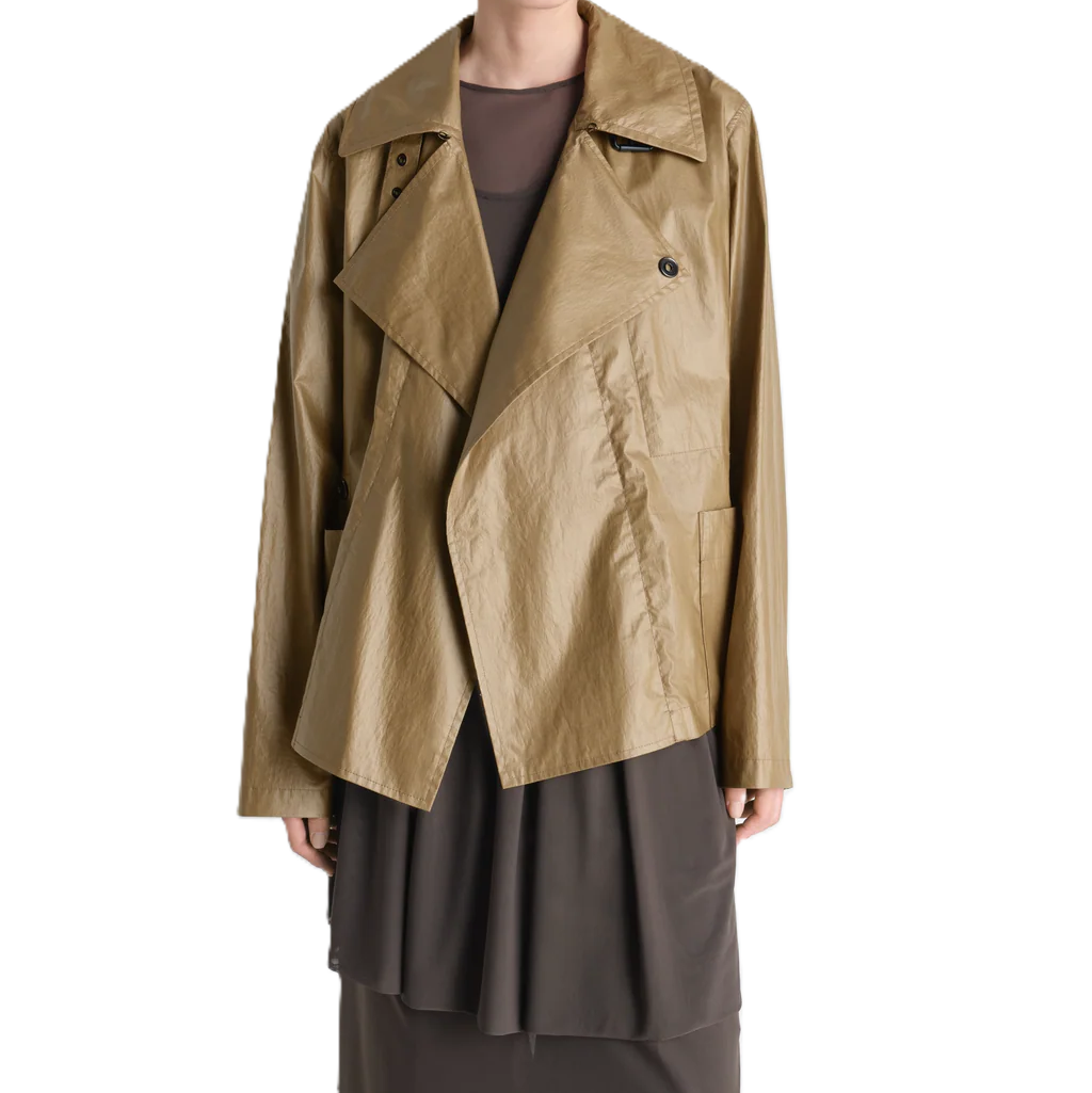Il design corto presenta una silhouette dritta, definita da una vita alta con cintura che slancia la figura. Il colletto generoso e la chiusura asimmetrica conferiscono un tocco d`avanguardia a un classico del guardaroba. Grazie alla natura tecnica e leggera del tessuto, il capo risulta tanto traspirante quanto protettivo, ideale per le mezze stagioni.