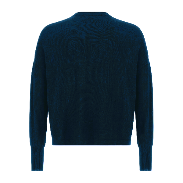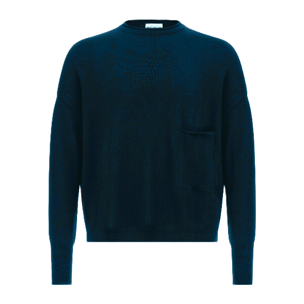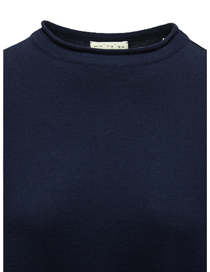 Maglione in navy realizzato in 100% lana merino di alta qualità firmato Ma'ry'ya. Presenta una tasca frontale, polsini di lunghezza media e un collo a barca leggermente arricciato, perfetto per un look elegante e confortevole da giorno o da ufficio.