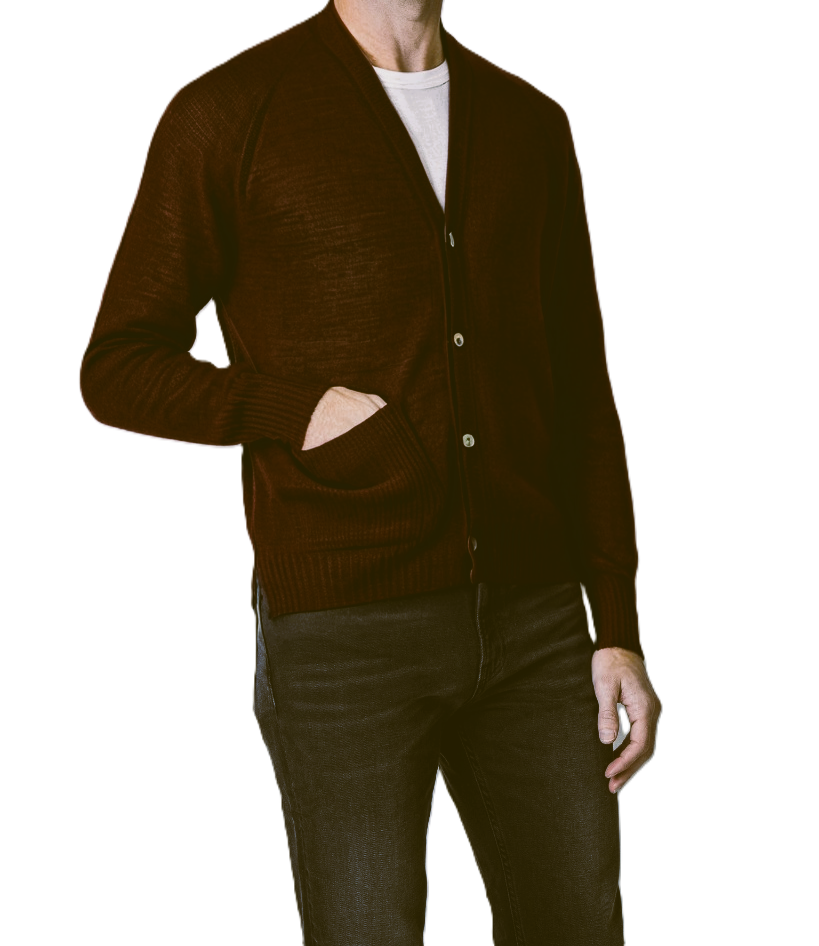 Cardigan in lana con chiusura a bottoni a contrasto. Scollo a V, colore marrone.