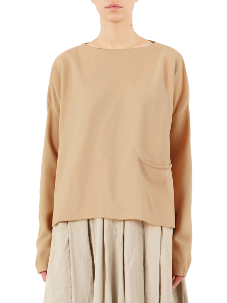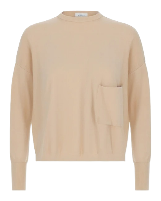 Maglione leggero e raffinato da donna in beige realizzato in 100% lana merino di alta qualità firmato Ma'ry'ya. Presenta una tasca frontale, polsini di lunghezza media e un collo a barca leggermente arricciato, perfetto per un look elegante e confortevole da giorno o da ufficio.
