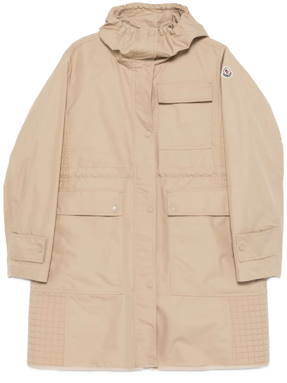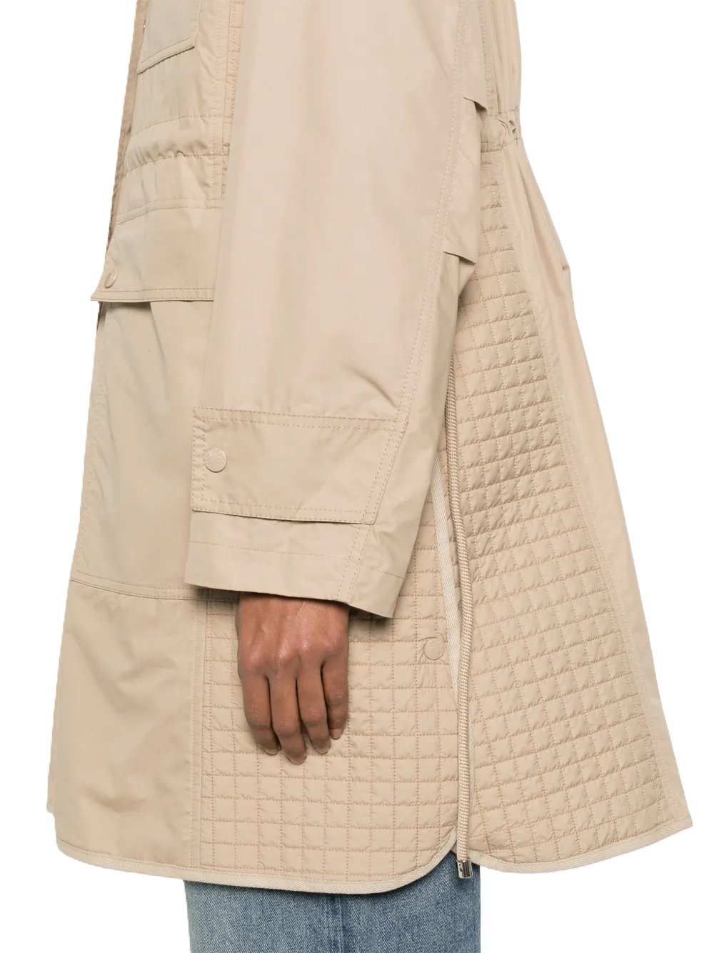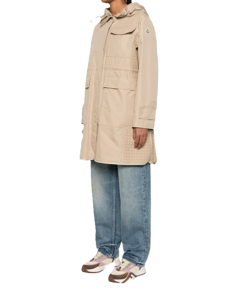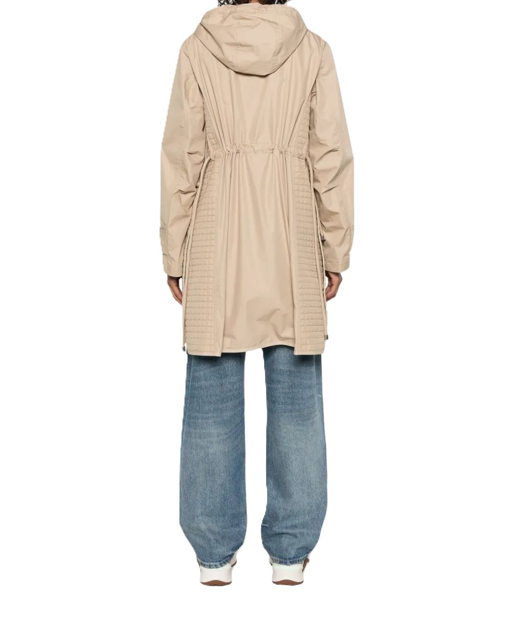 Parka Meudon beige sabbia, chiusura frontale con bottone automatico e zip, cappuccio con coulisse