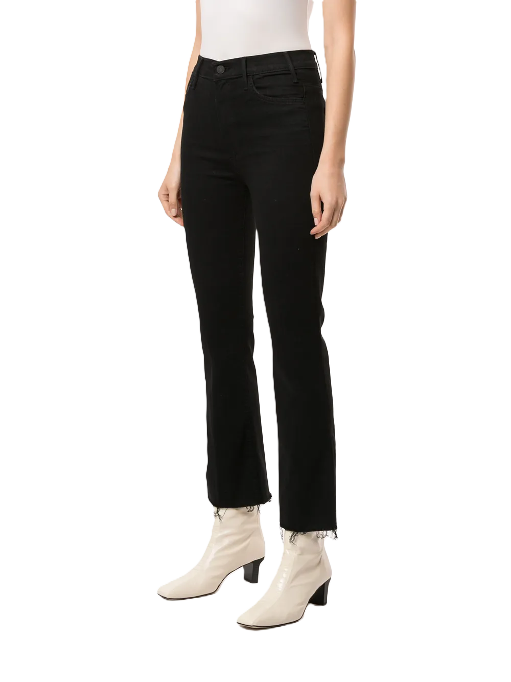 Jeans a zampa d'elefante Hustler alla caviglia, passanti per cintura in cotone elasticizzato nero classico, cinque tasche, vita alta, accorciato, svasato, bordo sfrangiato