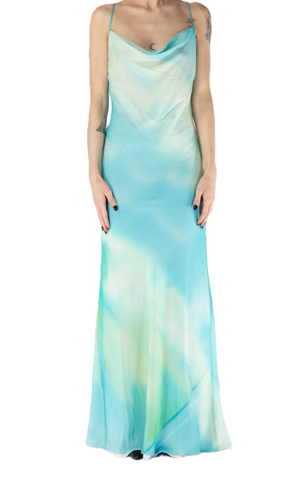 Abito con spalline sottili regolabili, schiena aperta, scollatura profonda. Orlo con volant.
