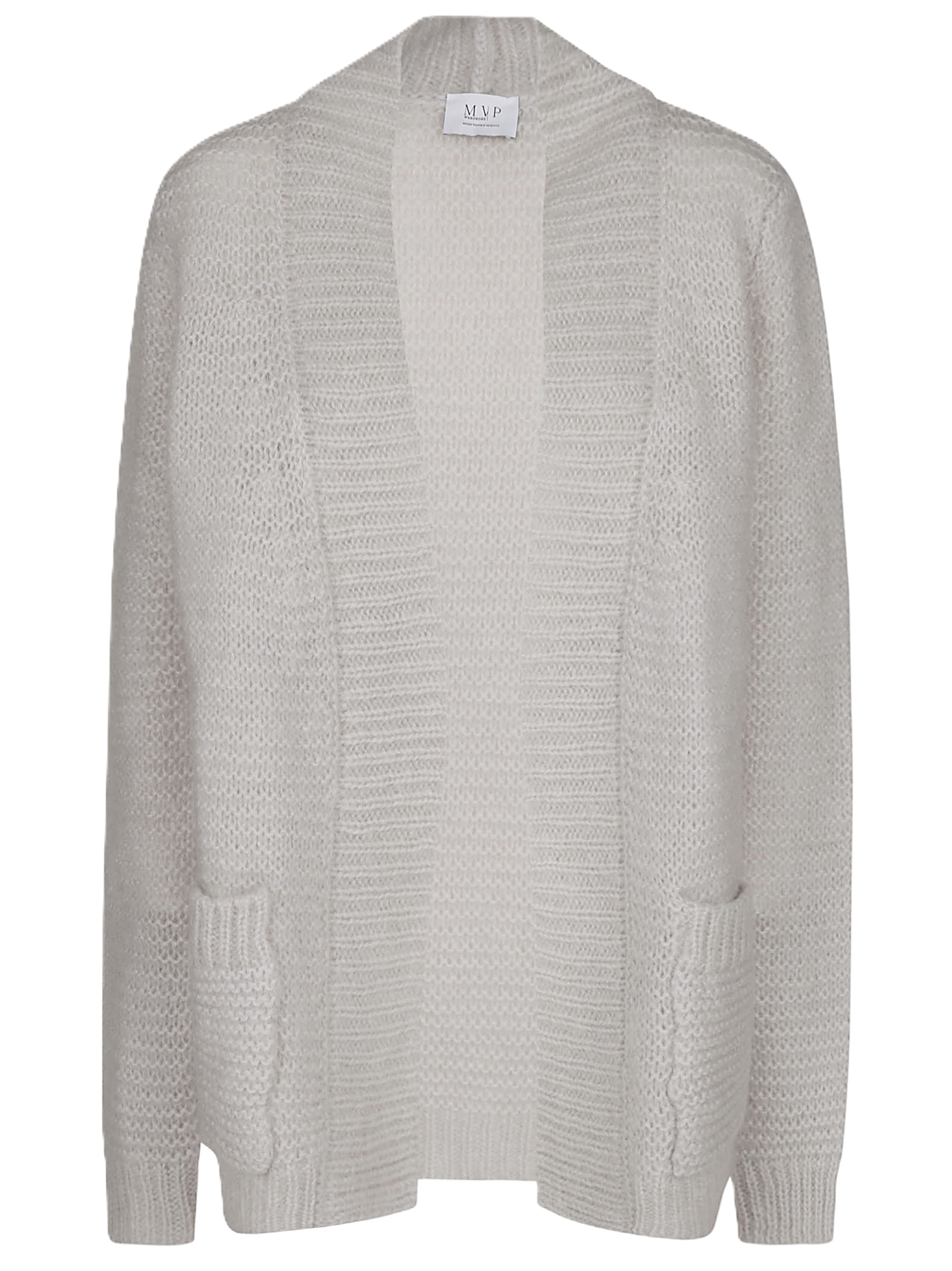 Cardigan in lana mohair MVP MARIA VITTORIA PAOLILLO, bordi a coste, due tasche laterali a filetto, aperto sul davanti.