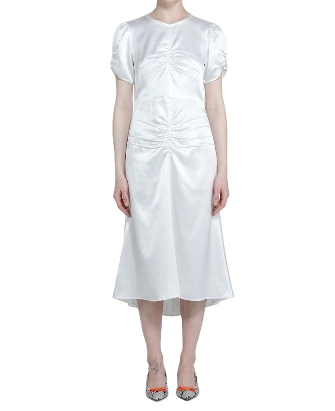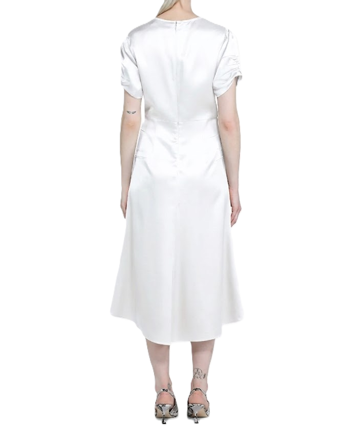 Abito longuette in shantung. Realizzato in tessuto di raso lucido, colore sabbia chiaro. Vita definita con ruches centrali e pieghe orizzontali, maniche corte con arricciatura. Lunghezza midi che arriva al polpaccio e orlo rifinito.