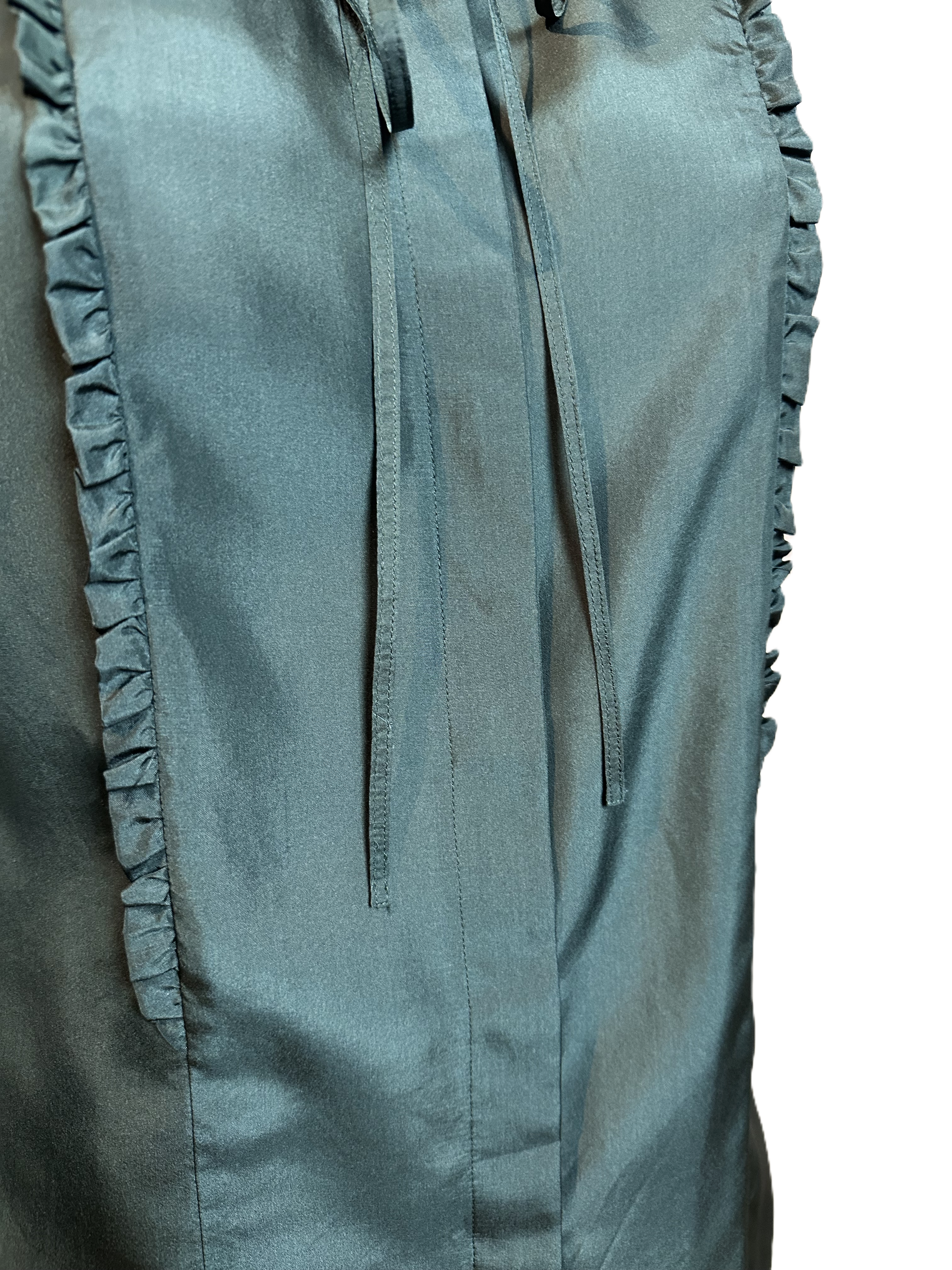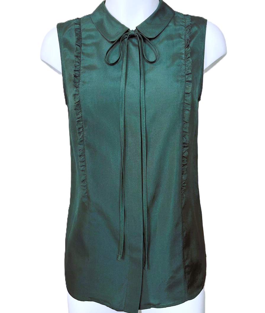 Camicia senza maniche, con fiocco al collo e rouches laterali, chiusura con bottoni nascosti.