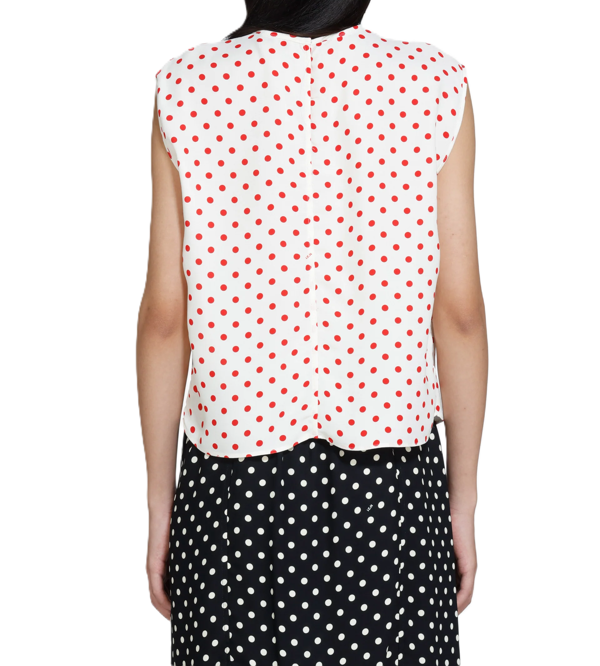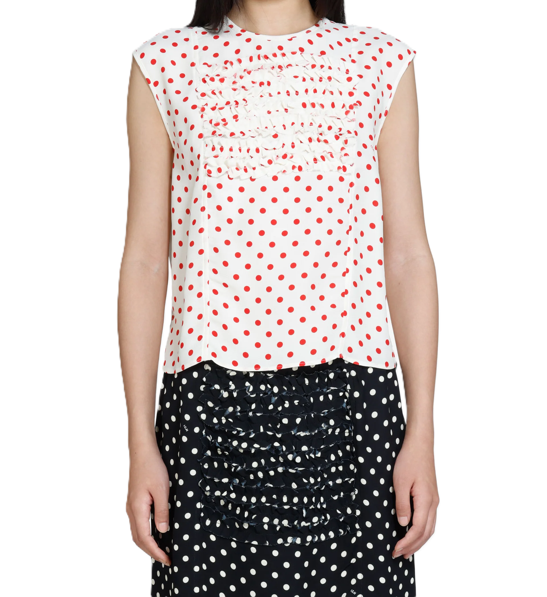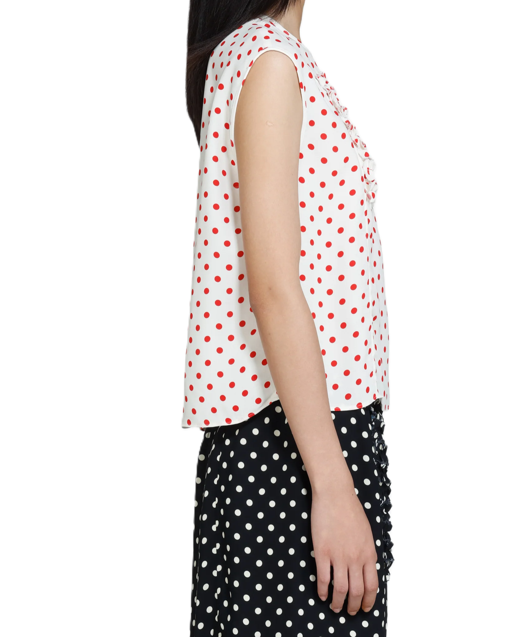 Top smanicato a pois, bianco con pois rossi. Presenta un dettaglio centrale con ruches, pieghe che aggiungono texture al capo. Il taglio dritto, senza maniche, offre una vestibilità rilassata.