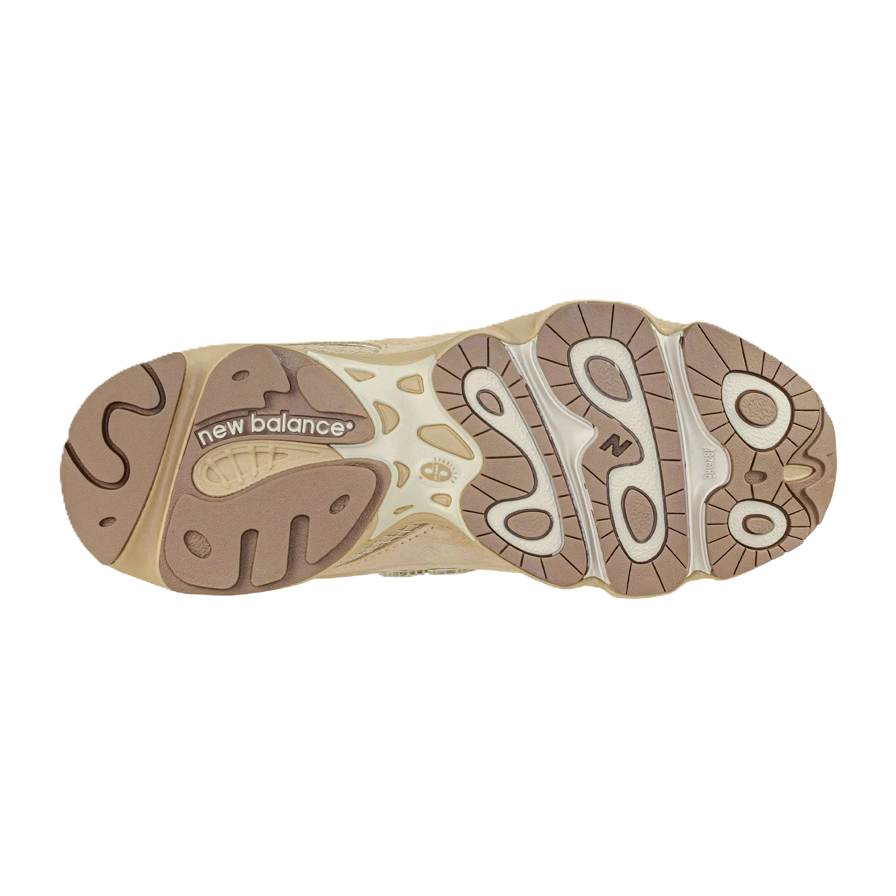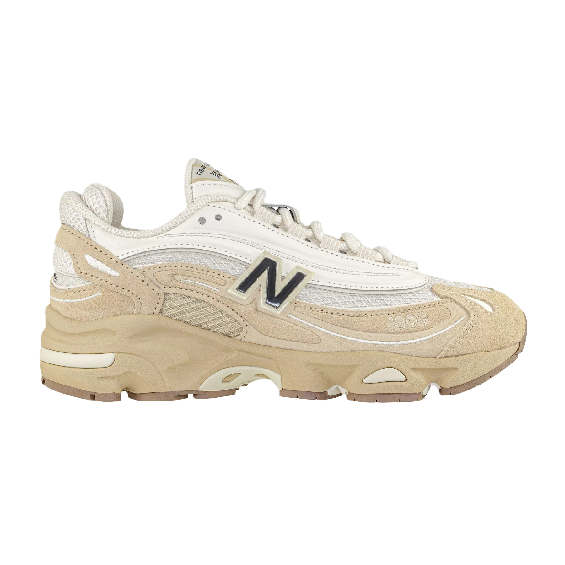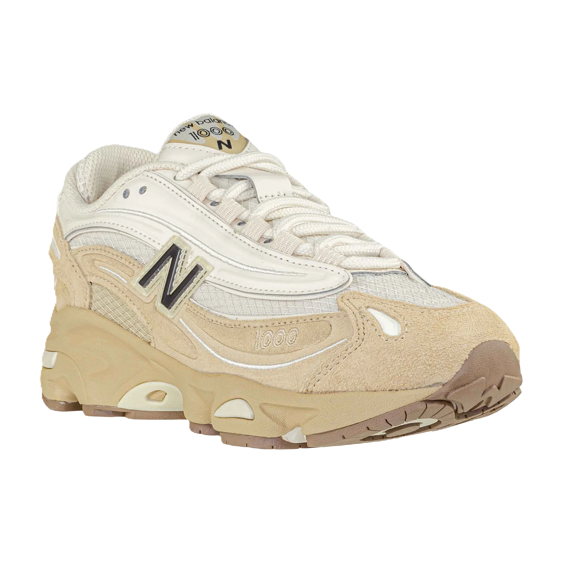 La New Balance rilancia il modello 1000, un classico lanciato nei anni '90, caratterizzato da uno stile audace e futuristico con un design semplice e pieno di dettagli. La tomaia è realizzata di strati di tessuto tecnico e rivestimenti in pelle e camoscio di colore crema e beige. Allacciatura esterna con un laccio color crema e occhielli in nylon. Il logo "N" gommato di colore nero. La suola è in gomma di colore beige con l'intersuola ABZORB sul tallone e sul avvampiede che fornisce una maggiore ammortizzazione e stabilità.