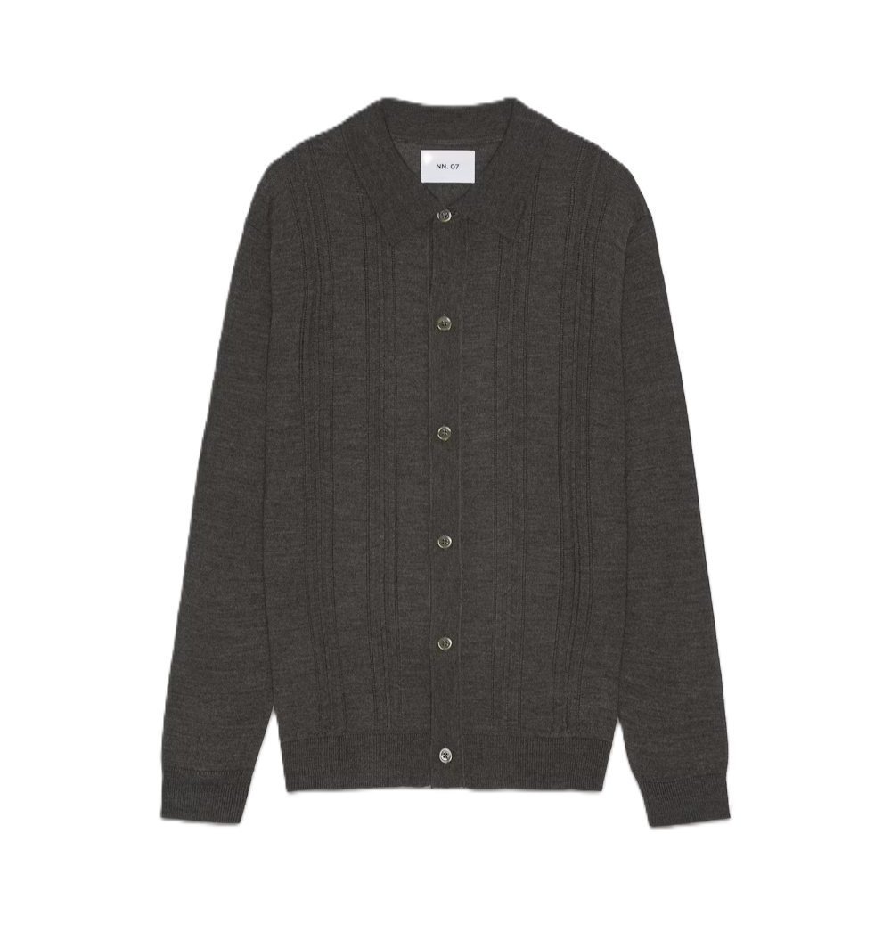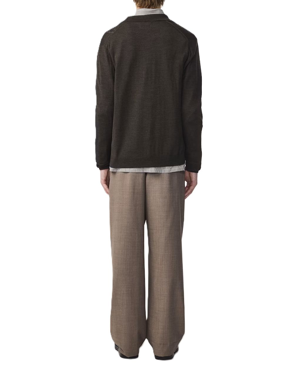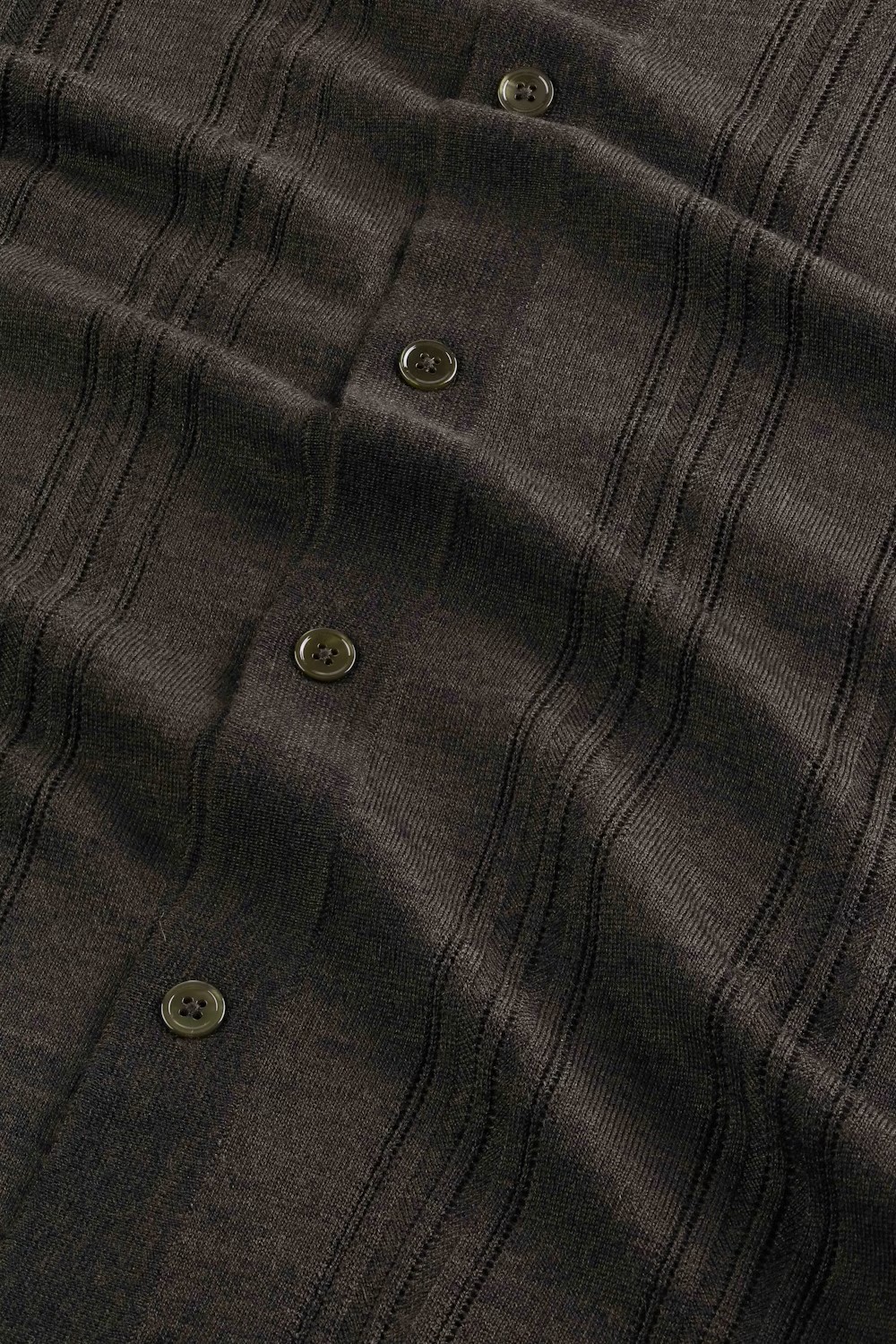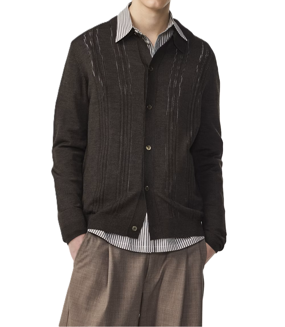 Cardigan polo leggero realizzato in morbido misto lana con un tocco di elasticità. Lavorato a punto traforato e rifinito con bottoni in madreperla.