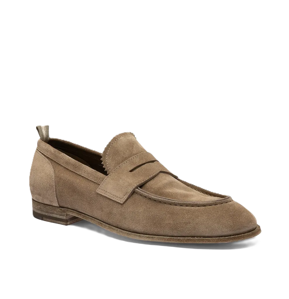 Mocassini Penny in Pelle Scamosciata, la rivisitazione di un classico per il guardaroba contemporaneo. Realizzati a mano in Italia, i mocassini penny Solitude 001 presentano una silhouette in pelle scamosciata marrone con interno sfoderato che strizza l'occhio a un'estetica rilassata ma al contempo sofisticata. Montati su una resistente suola in cuoio, questi mocassini sono pronti per affrontare con eleganza il ritmo frenetico della vita di tutti giorni.