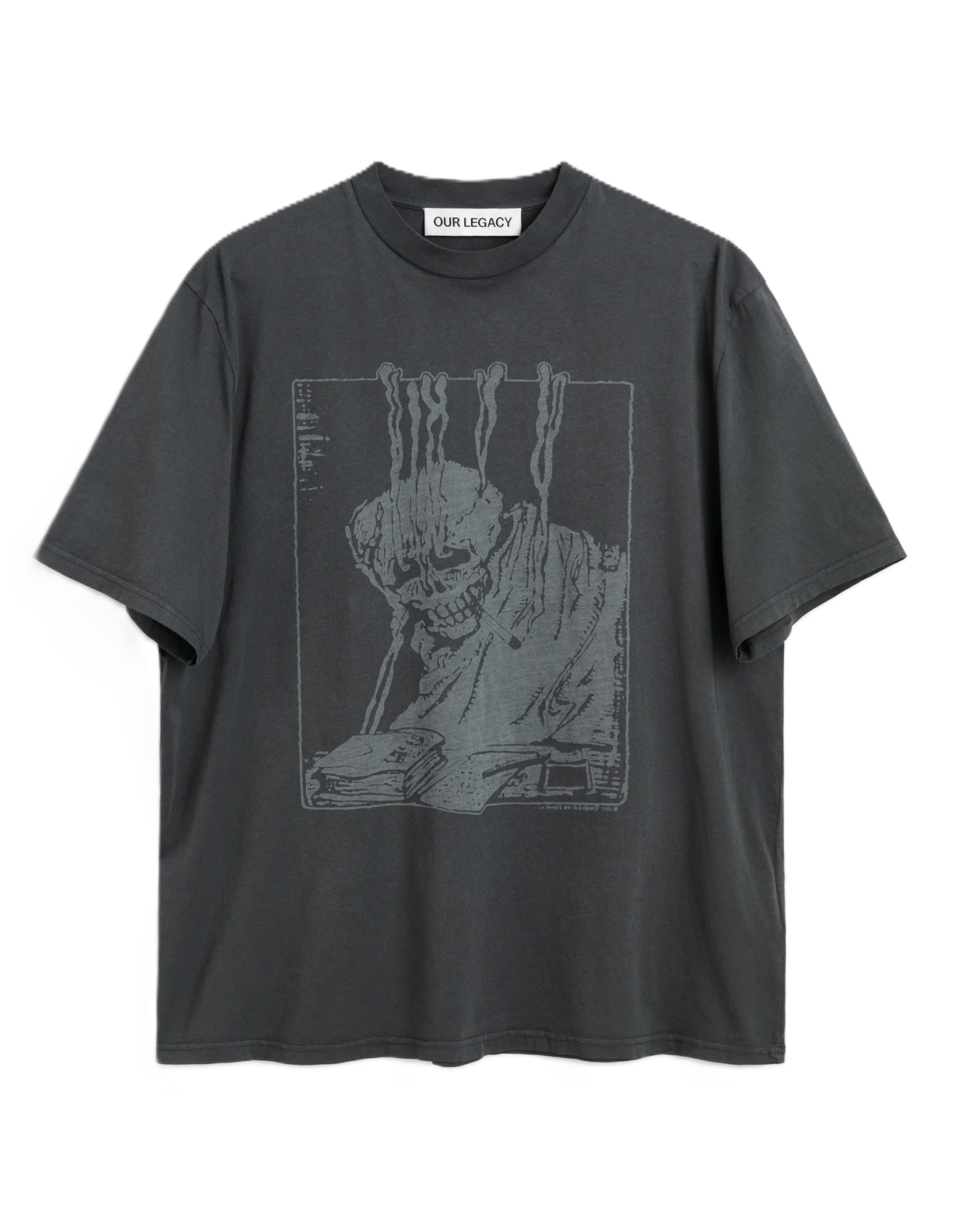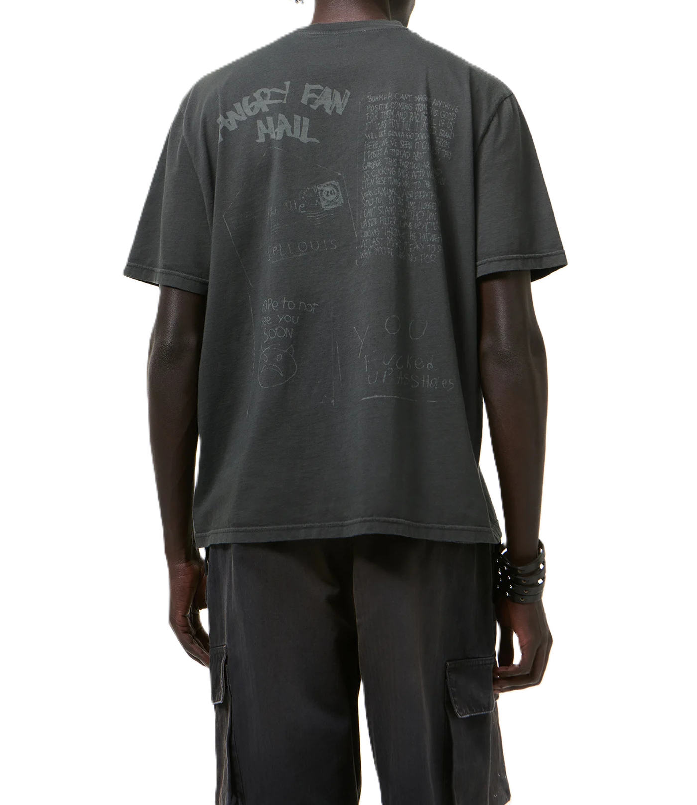 La nostra T-shirt Box in jersey di cotone portoghese. Realizzata in jersey di cotone portoghese, la T-shirt Box è tinta a pigmento e stampata al laser per bruciare il colore, rivelando la nostra grafica "Angry Fan Mail", un omaggio satirico ai commenti dei social media. Ha una vestibilità ampia e squadrata e presenta un colletto a costine sottili e un orlo dritto.