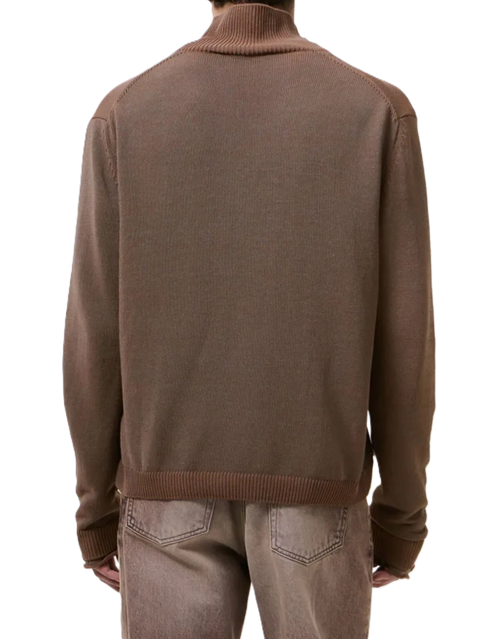 Cardigan Float Funnel marrone, dettagli a coste, collo alto, chiusura con cerniera frontale, maniche lunghe, orlo dritto