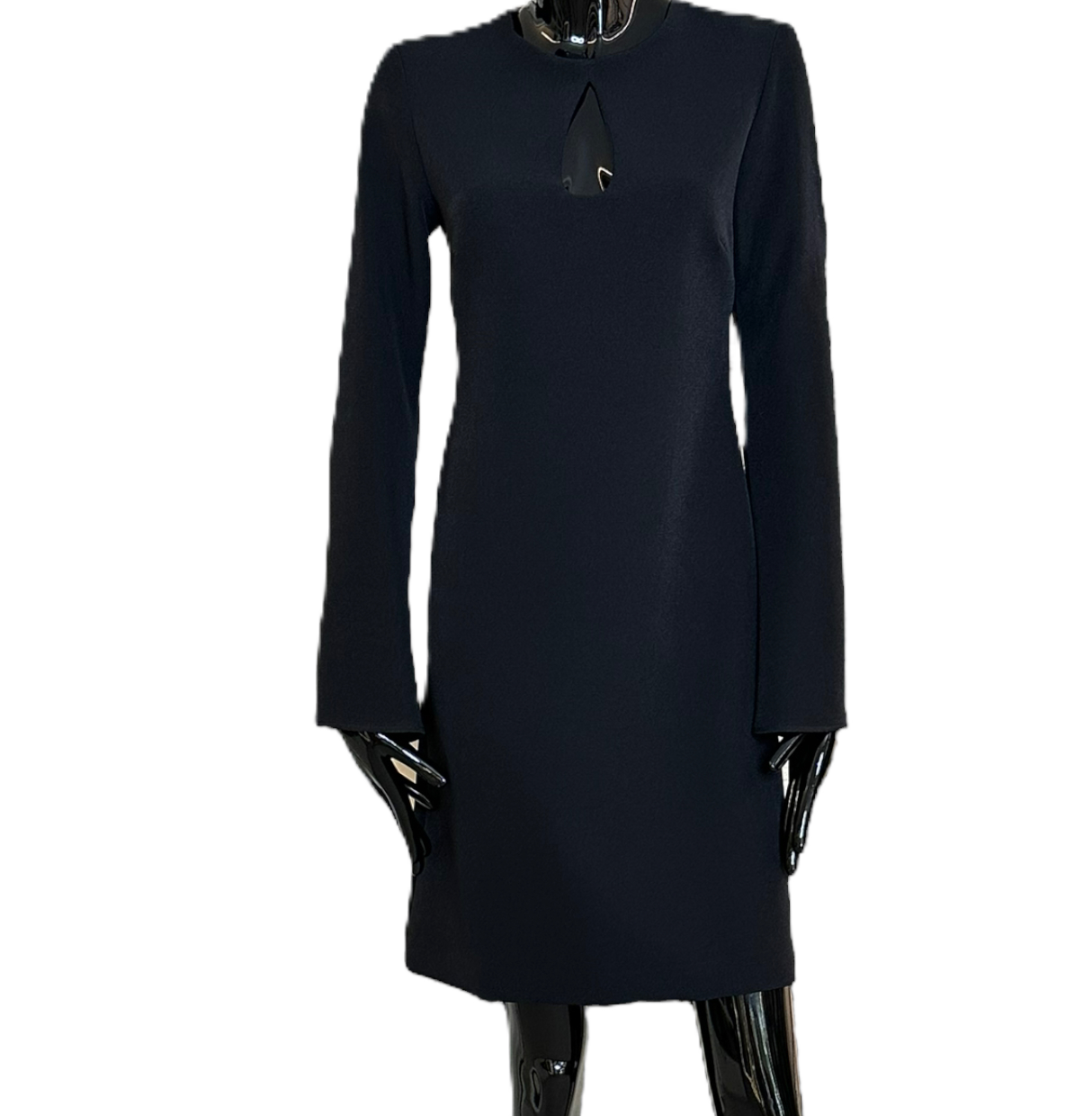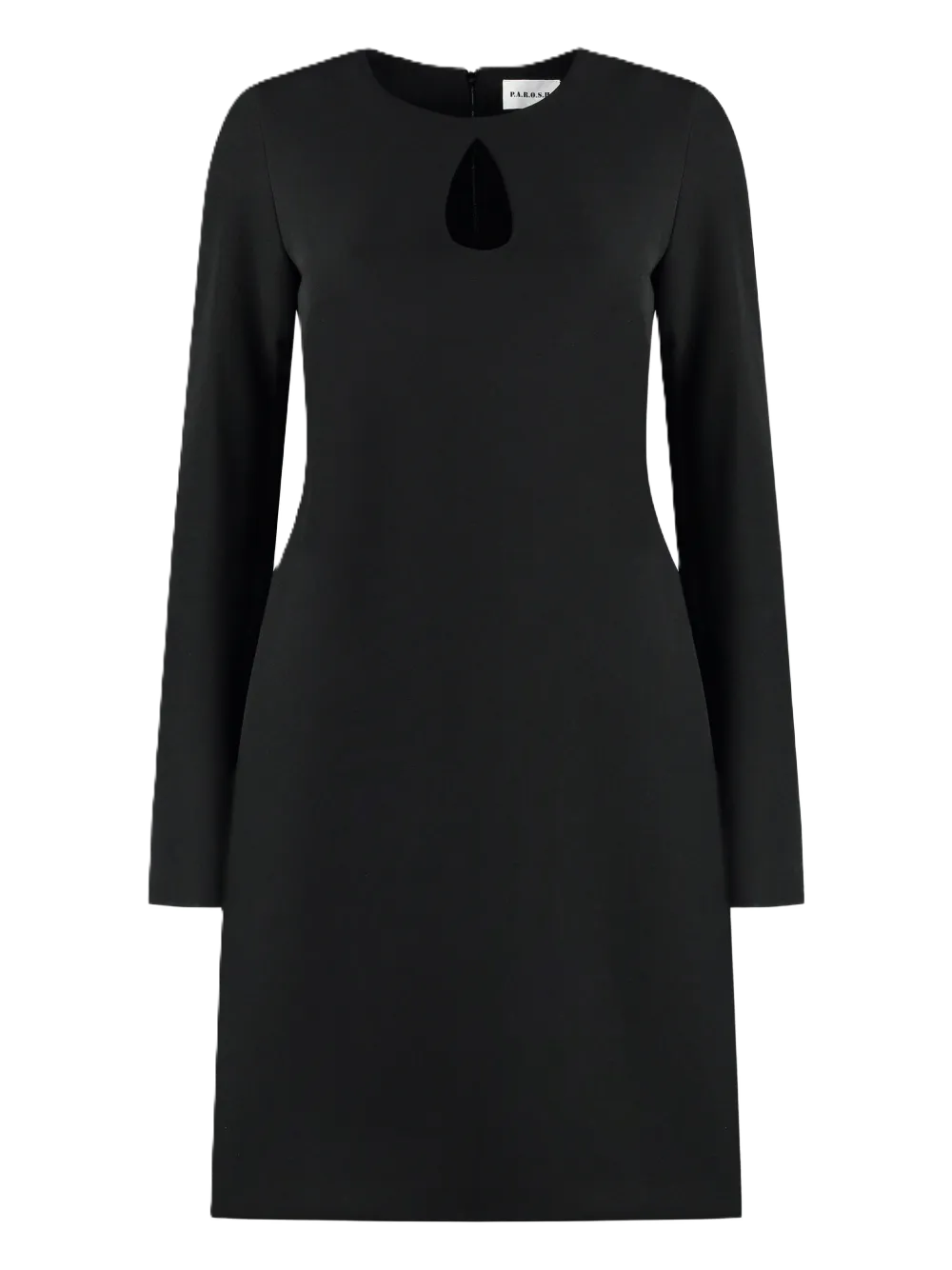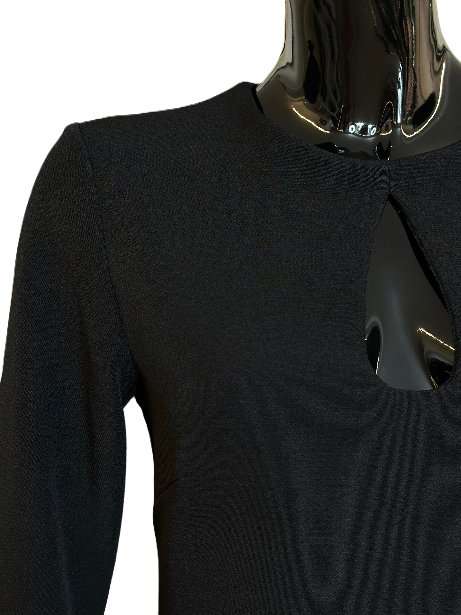 abito dallo scollo rotondo con apertura sul decolte, chiusura posteriore con zip, maniche lunghe svasate