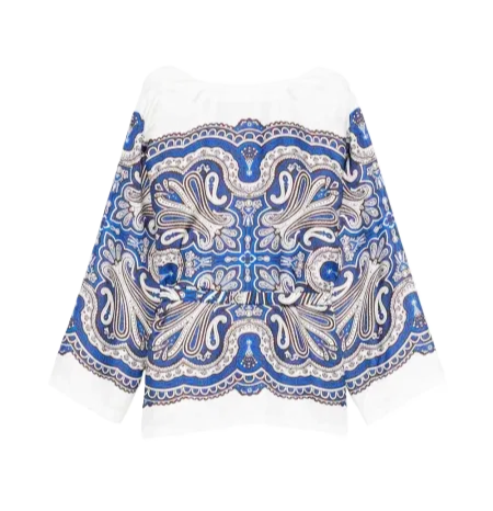 Stampa paisley bianca e blu , cintura in vita, scollo a V, maniche lunghe.