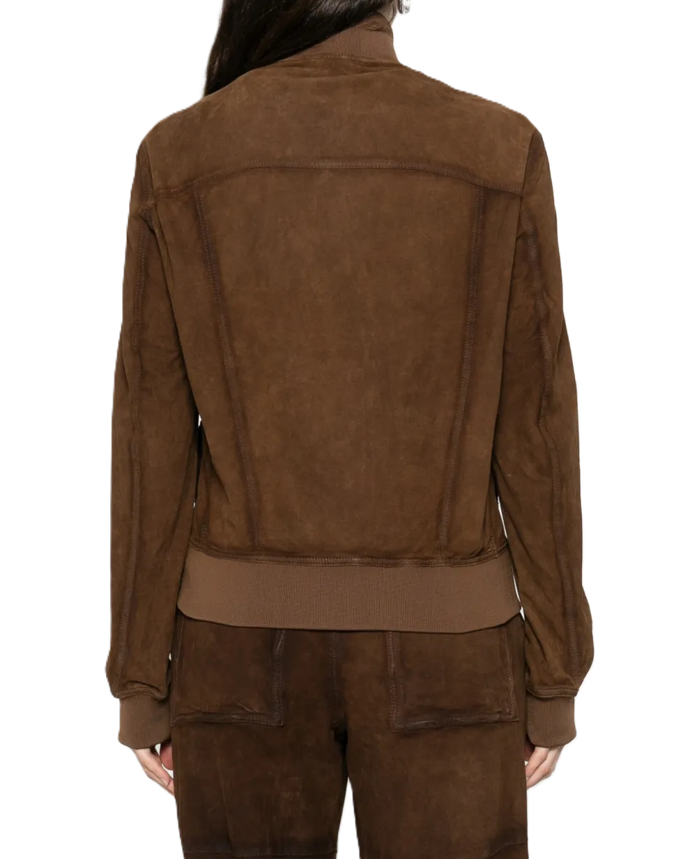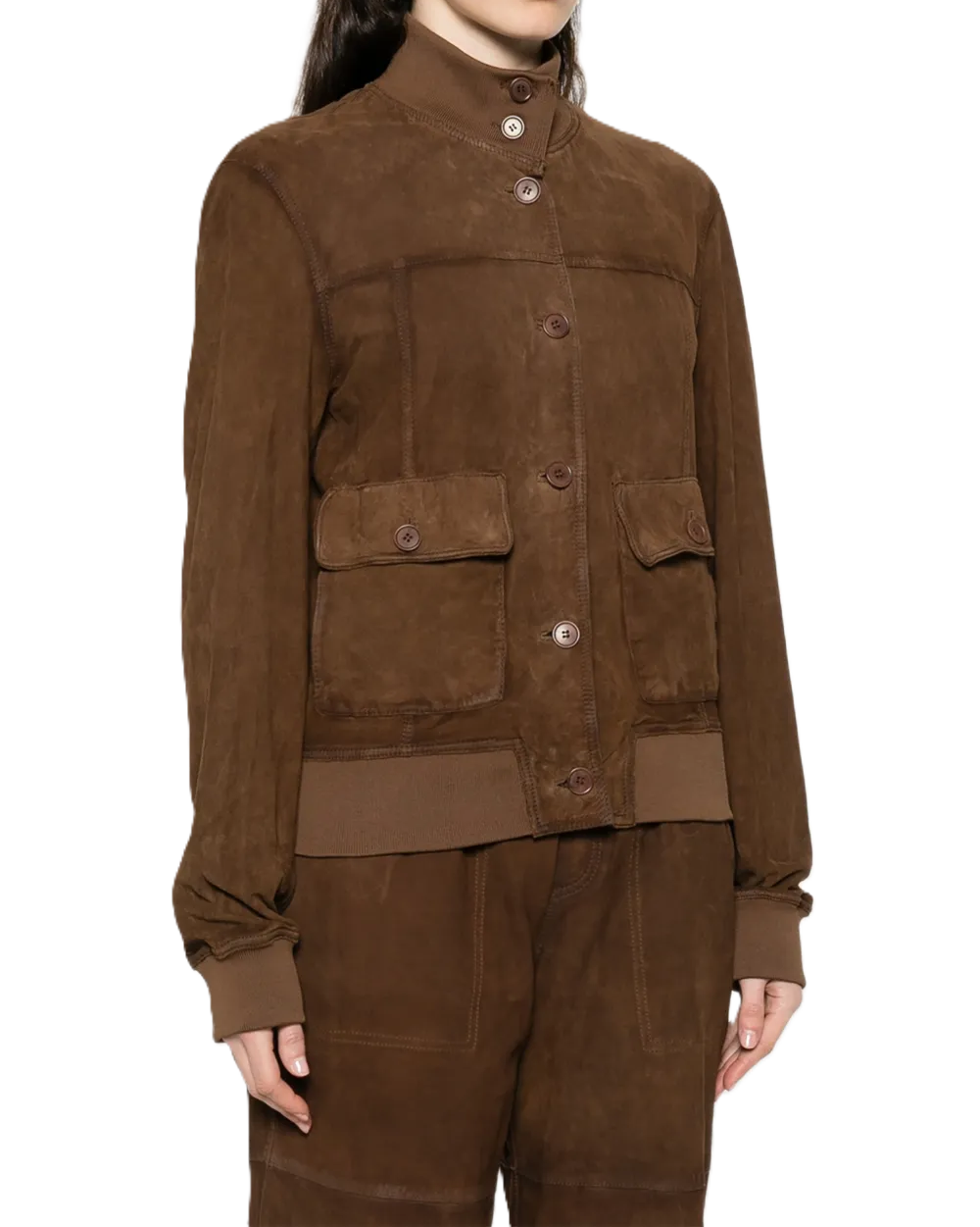 giacca scamosciata abbottonata con colletto rialzato, chiusura a bottone, tasche applicate, maniche lunghe, polsini a coste, orlo a coste