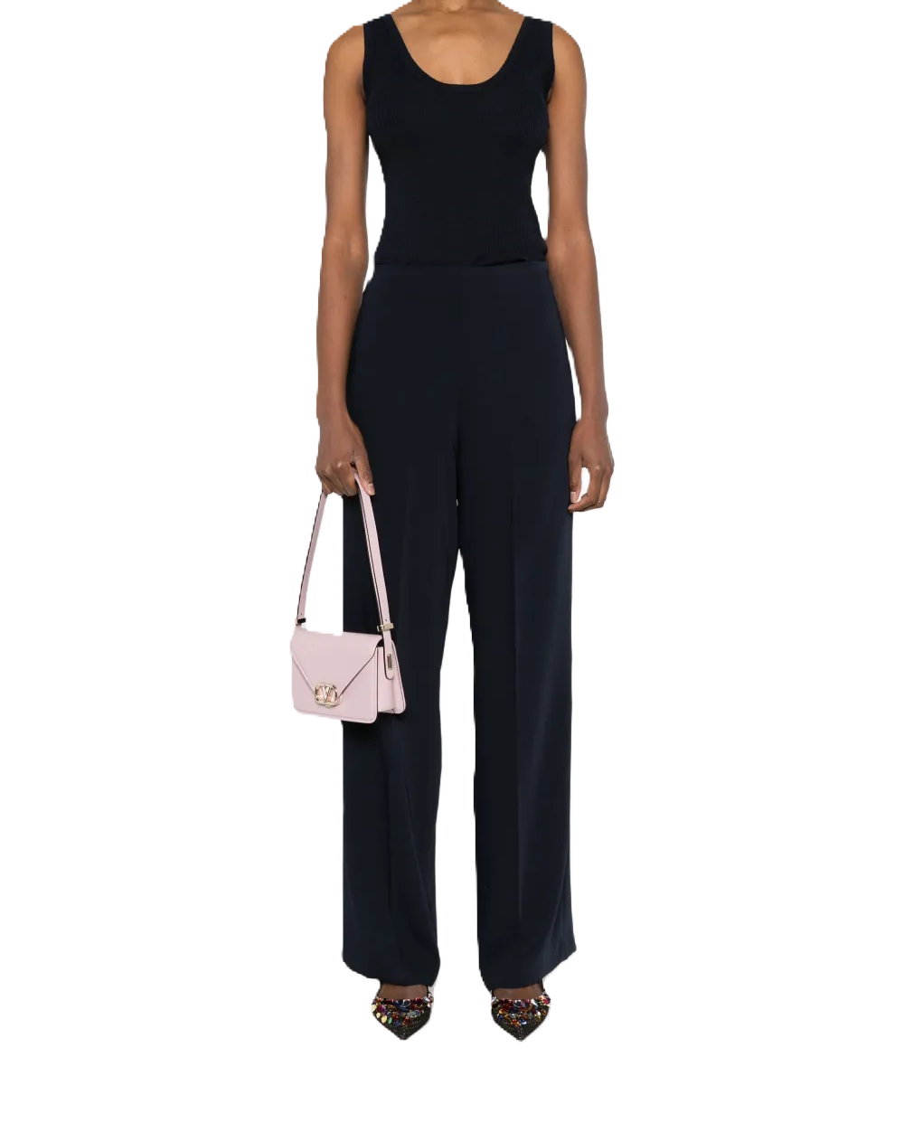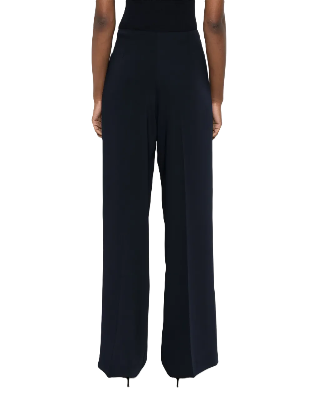 Pantaloni Panty blu, chiusura laterale con zip e gancio nascosta, dettagli con pince, piega stirata.