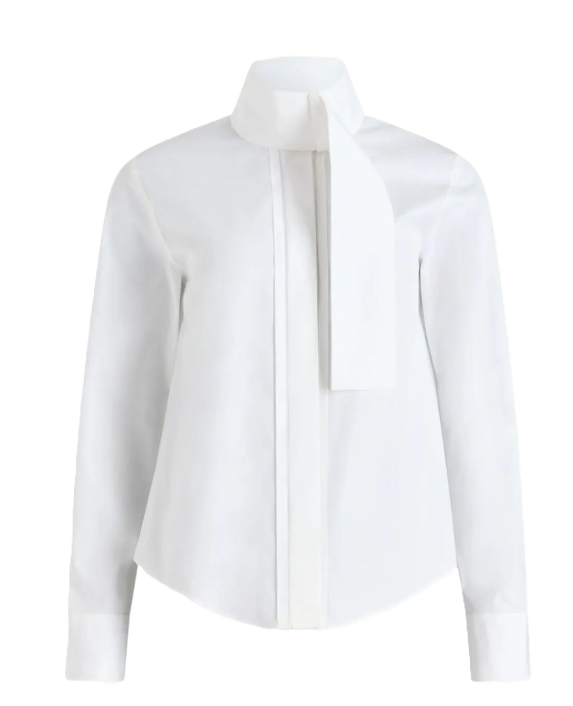 Blusa in cotone bio bianco. Collo a sciarpa con passante sul davanti. Chiusura sul davanti con bottone nascosto. Polsini abbottonati. Logo Patou ricamato sul davanti.