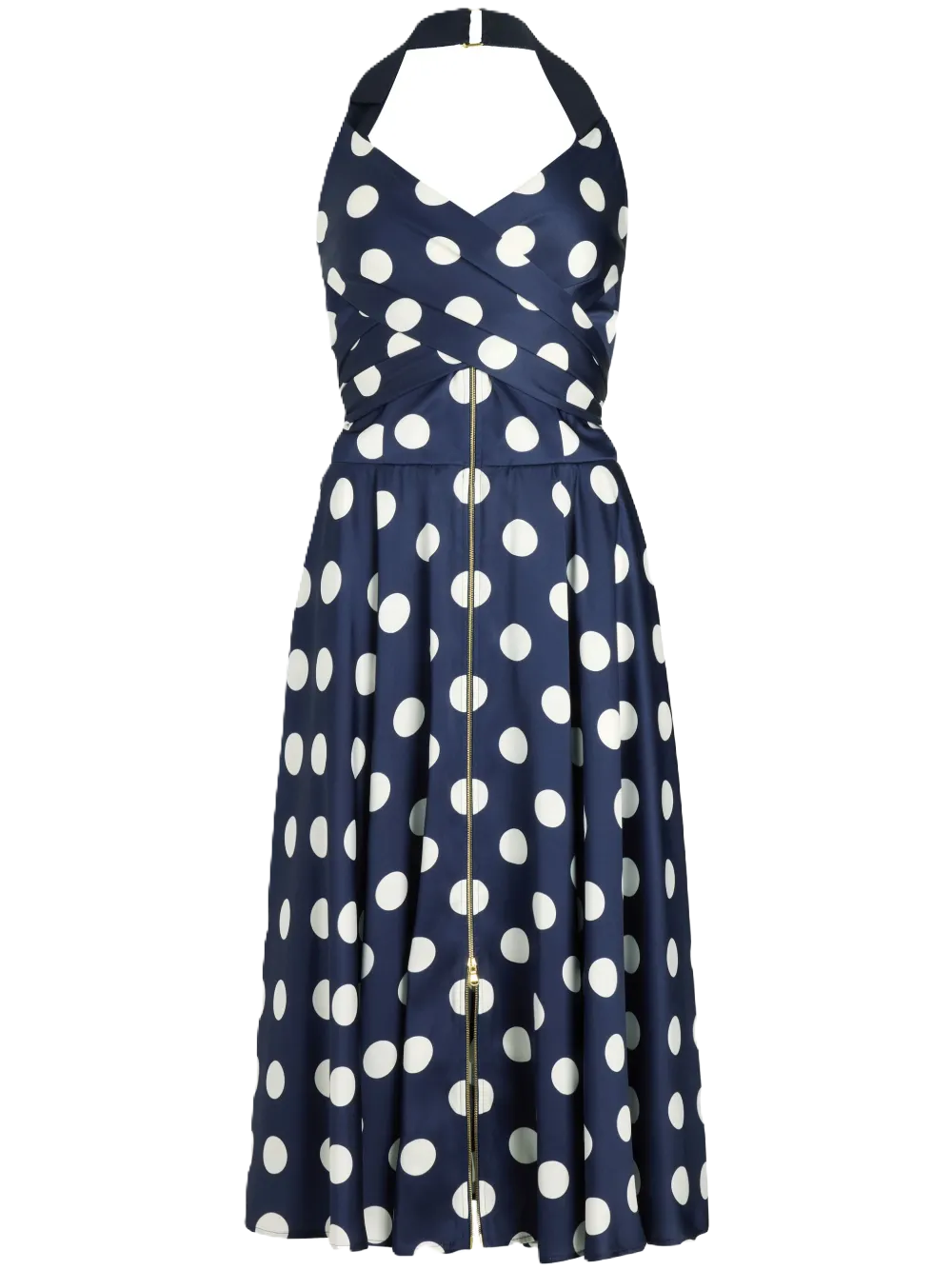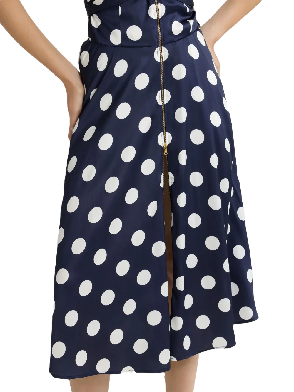 Abito midi con scollo all'americana blu con chiusura frontale con zip, stampa a pois, spalline larghe