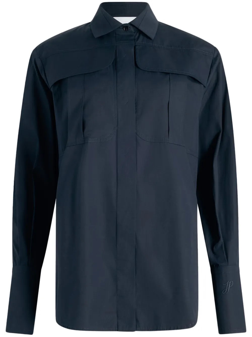 Camicia Safari in popeline blu navy, abbottonatura frontale nascosta, due tasche con patta sul petto, polsini con bottone.