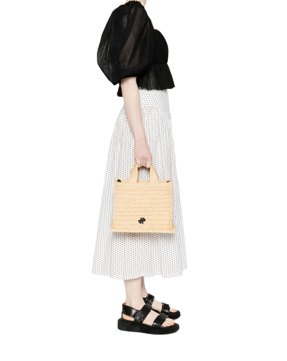 Borsa tote JP piccola beige/nero in rafia, design intrecciato, due manici piatti, tracolla rimovibile, cinturino con logo, bottoni con logo inciso, applicazione frontale con logo, scomparto unico, design senza fodera
