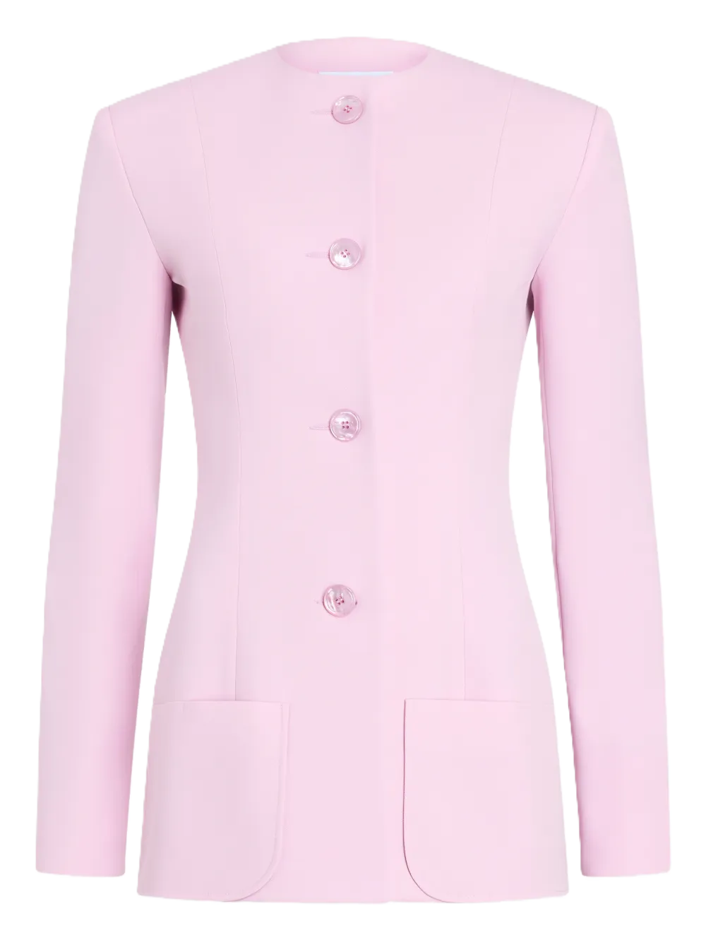 Giacca senza colletto rosa chiaro, design aderente, chiusura frontale con abbottonatura, girocollo
