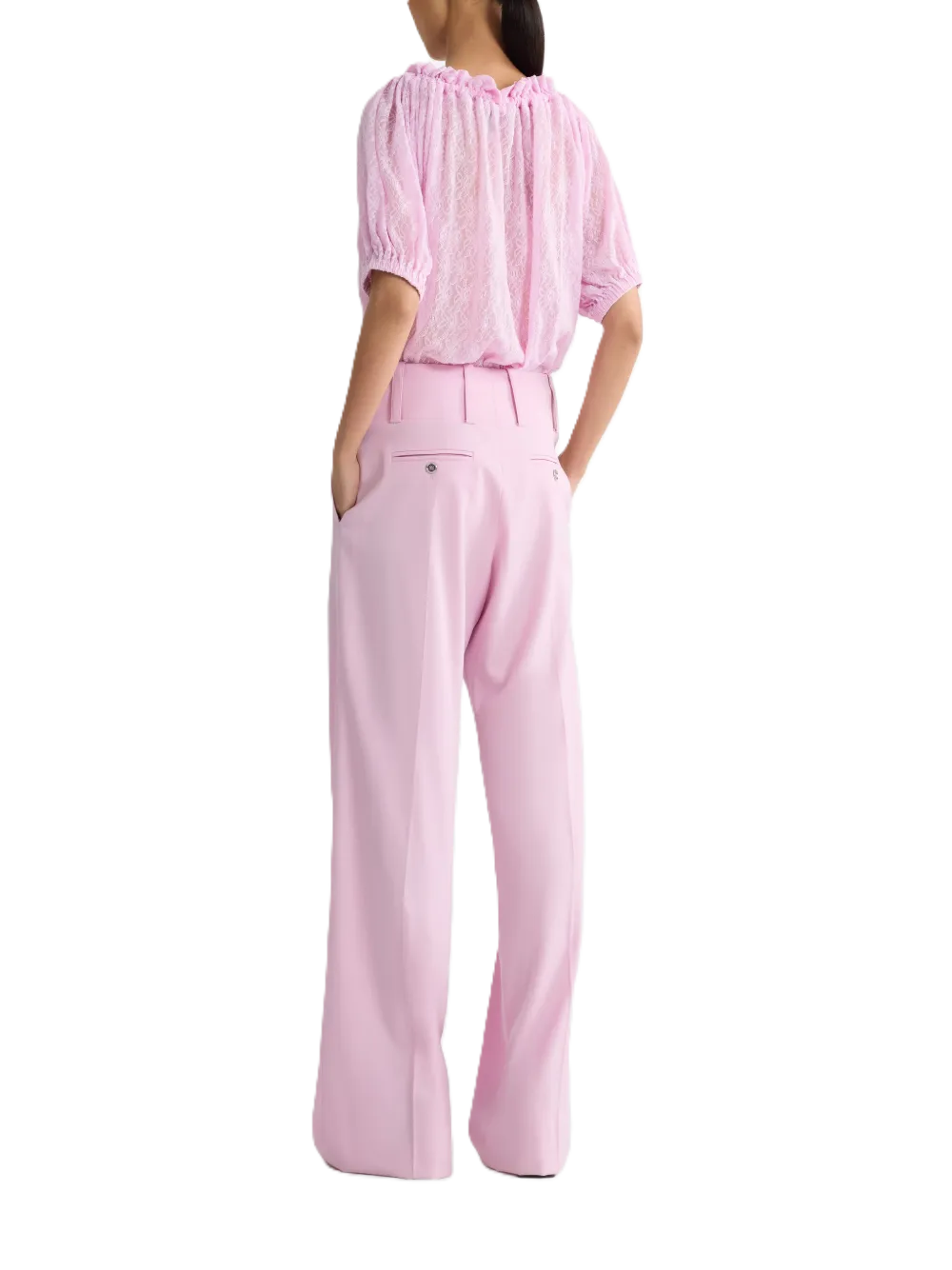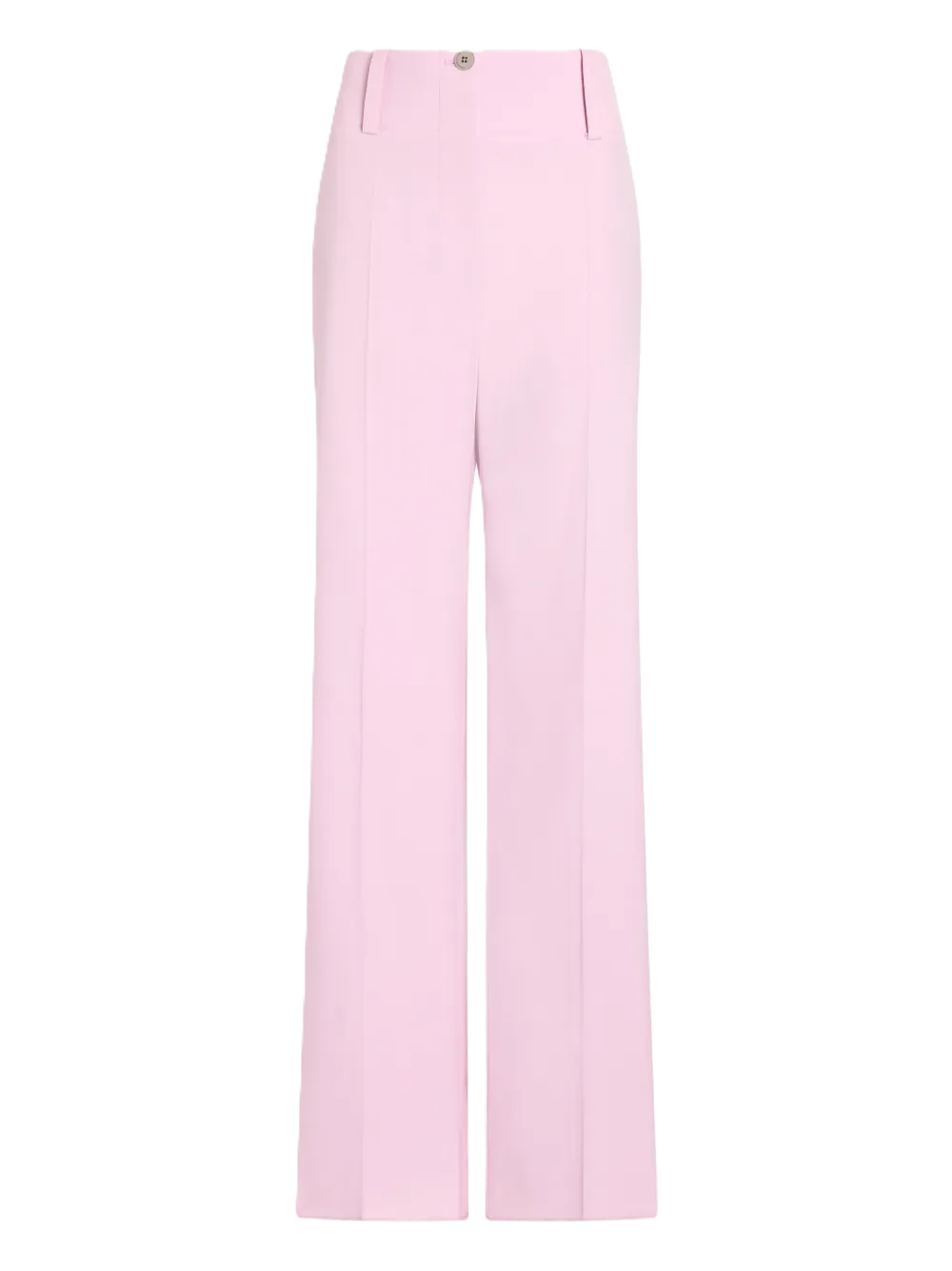 pantaloni dritti con vita alta, passanti per cintura large, color rosa, tasche a filetto con bottone, gamba dritta, chiusura con bottoni