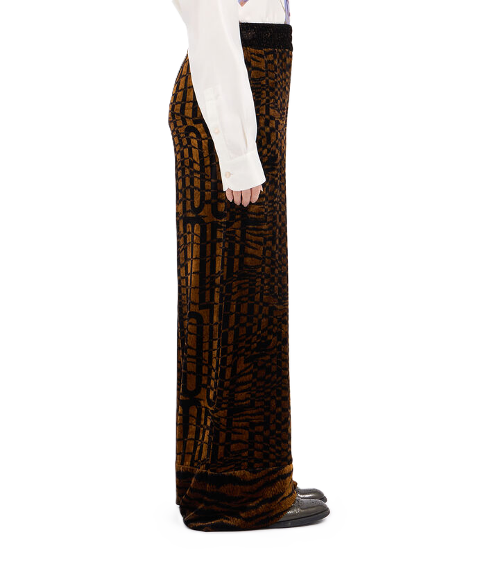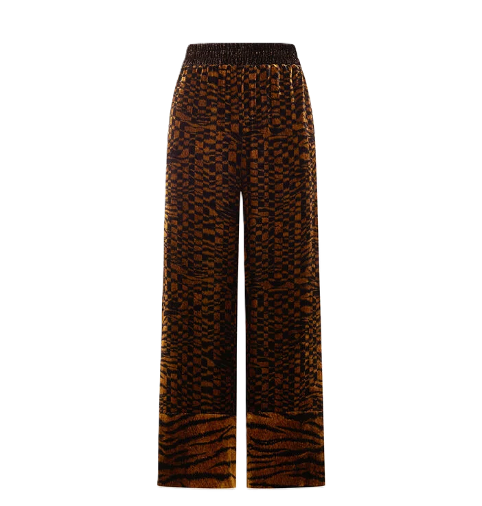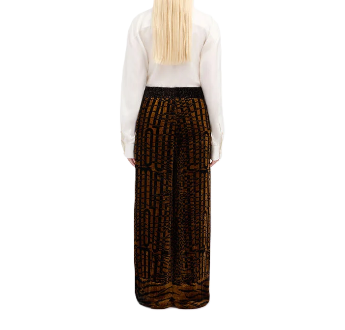 KANADA è un pantalone palazzo in viscosa e seta che unisce eleganza scenografica e fascino materico. La silhouette ampia cade con una fluidità leggera, mentre il velluto dévoré rivela motivi ornamentali--dai ricci barocchi in ambra calda ad astrazioni tribali e tocchi animalier. La vita elasticizzata dona comfort, mentre la texture sontuosa crea profondità visiva. Perfetto con una blusa coordinata o un top minimal per un equilibrio deciso.