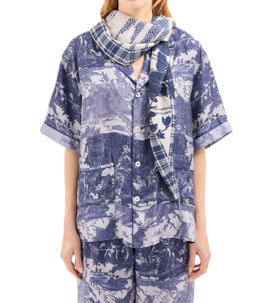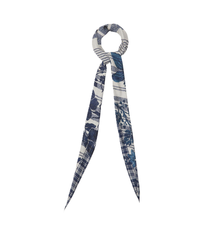 Questa sciarpa allungata in twill di seta conquista con i suoi intricati motivi floreali blu navy e avorio, che evocano una serena eleganza. L'armoniosa fusione di pattern geometrici e botanici offre un tocco di raffinata maestria. Perfetta come cravatta da collo o accessorio per i capelli, impreziosisce ogni ensemble con un sussurro di sofisticatezza.