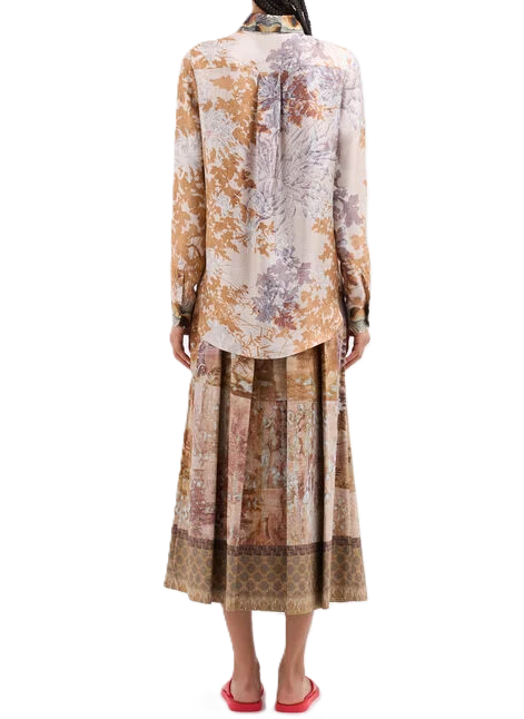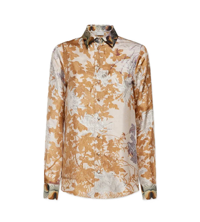 Questa raffinata camicia in seta a maniche lunghe presenta un ricco motivo di fogliame autunnale nelle calde tonalità dell'ocra e del lavanda polveroso. Il delicato disegno floreale evoca un senso di romanticismo senza tempo, mentre colletto e polsini a contrasto aggiungono un tocco di modernità. Abbinala a pantaloni sartoriali per un insieme elegante e sofisticato.