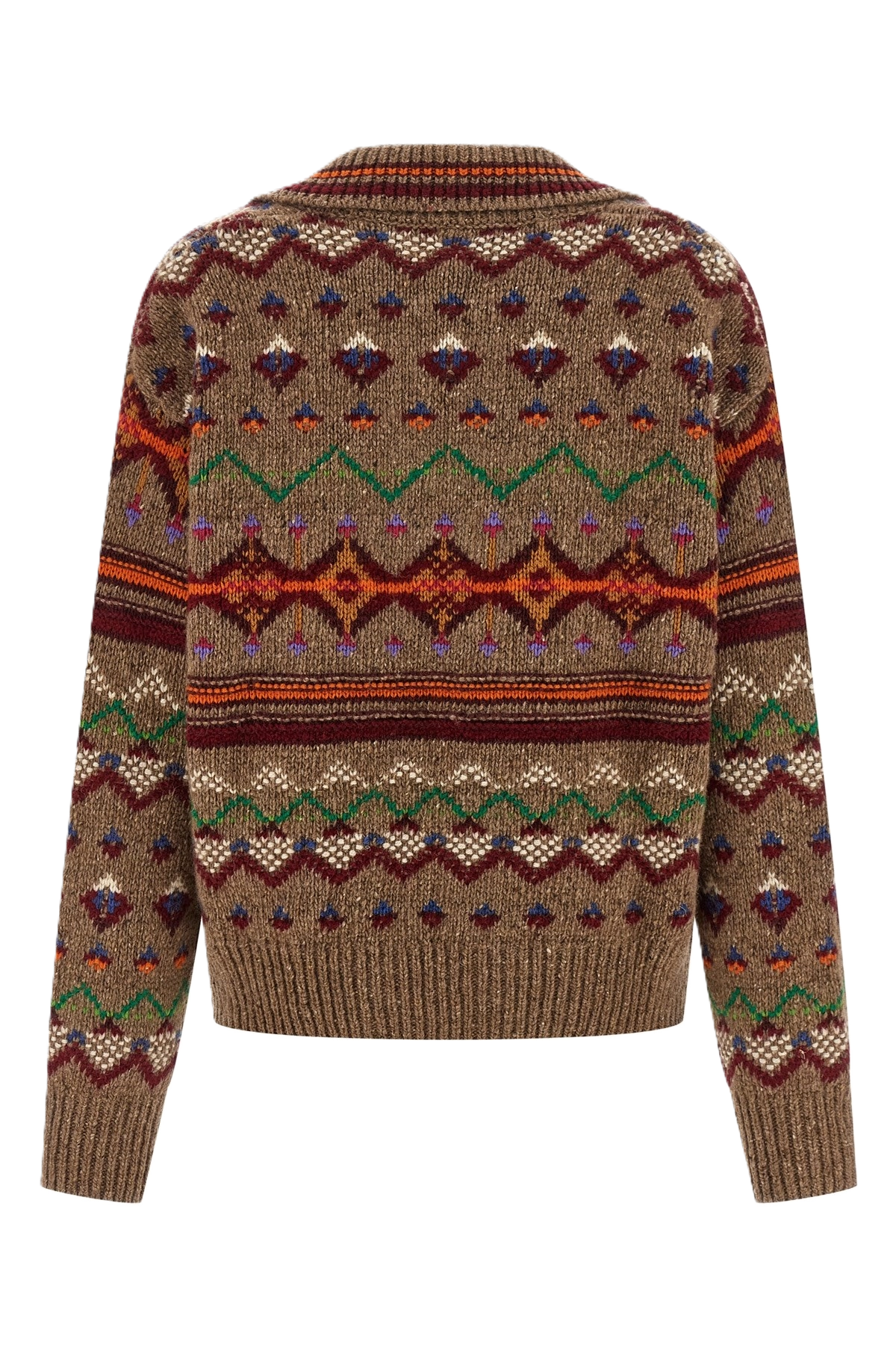 Maglione in lana fantasia jacquard, colletto, scollo a V con dettaglio lacci regolabili, manica lunga con polsino e spalla scesa.
