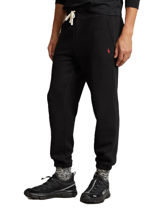 Pantaloni sportivi logo Polo Ralph Lauren, in misto cotone nero, vita media elasticizzata, chiusura coulisse, due tasche laterali, dettaglio ricamo logo rosso, una tasca piatta retro, gamba dritta.