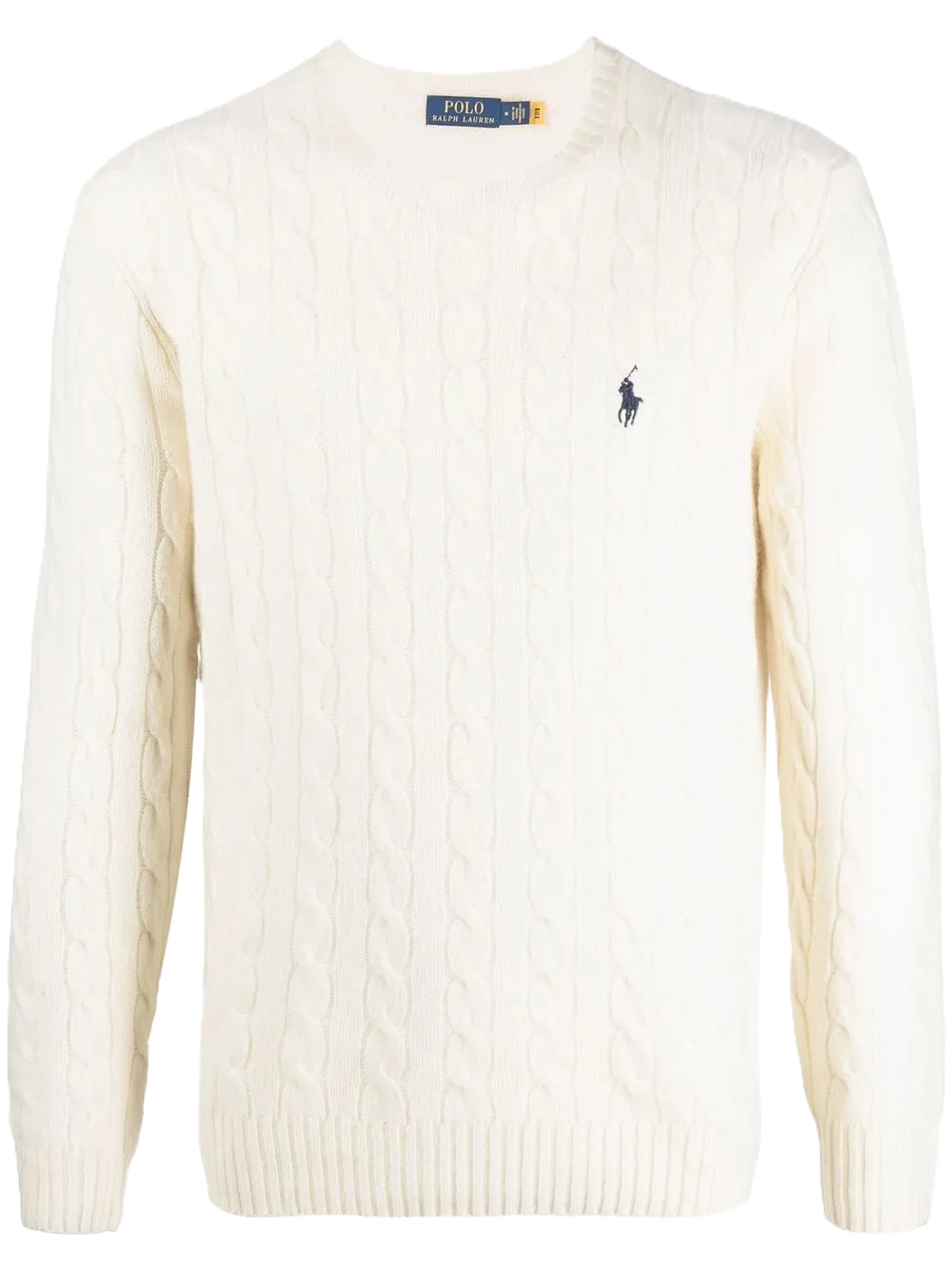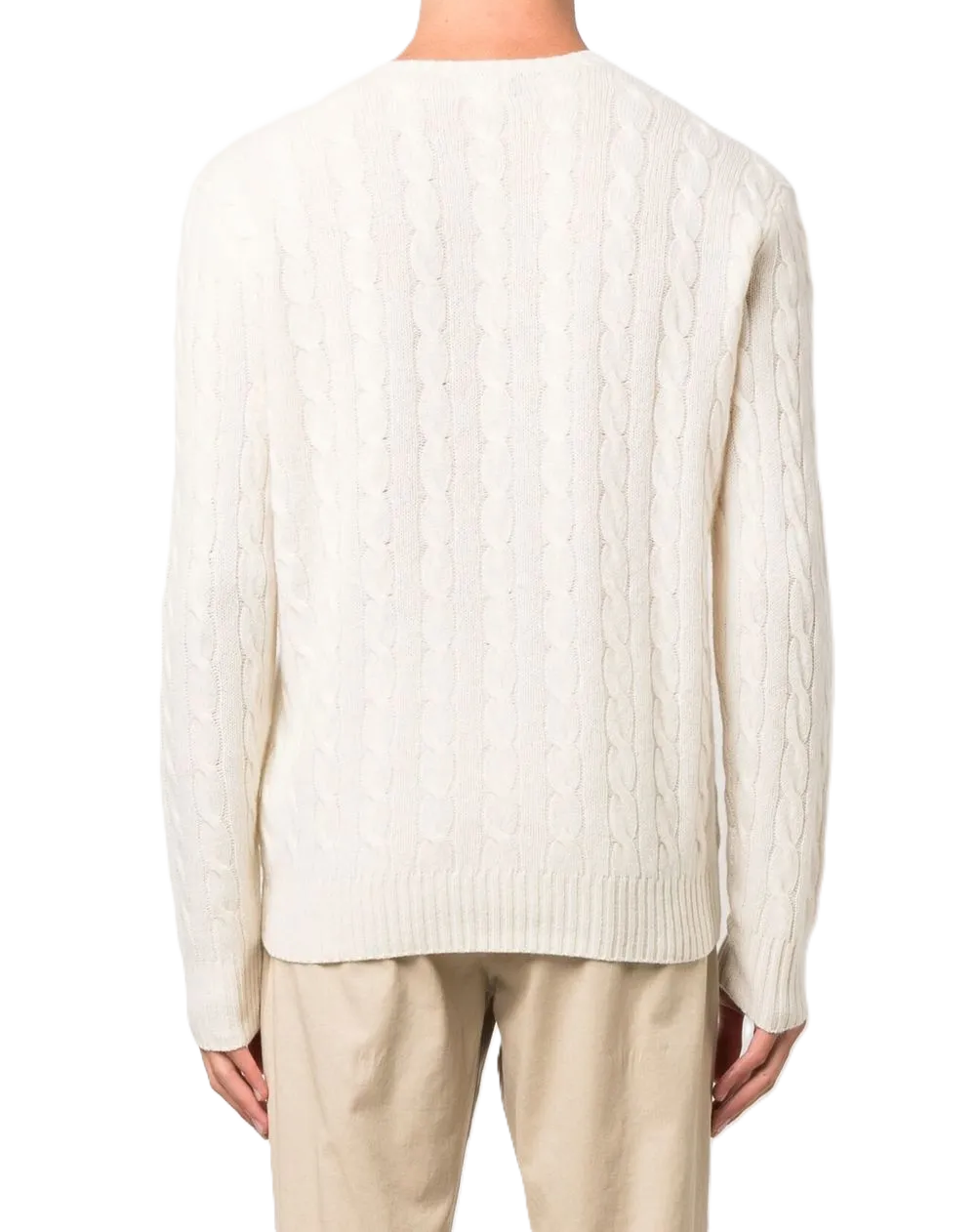 Maglione girocollo in maglia a trecce color crema, maniche lunghe, misto lana e cashmere, logo ricamato