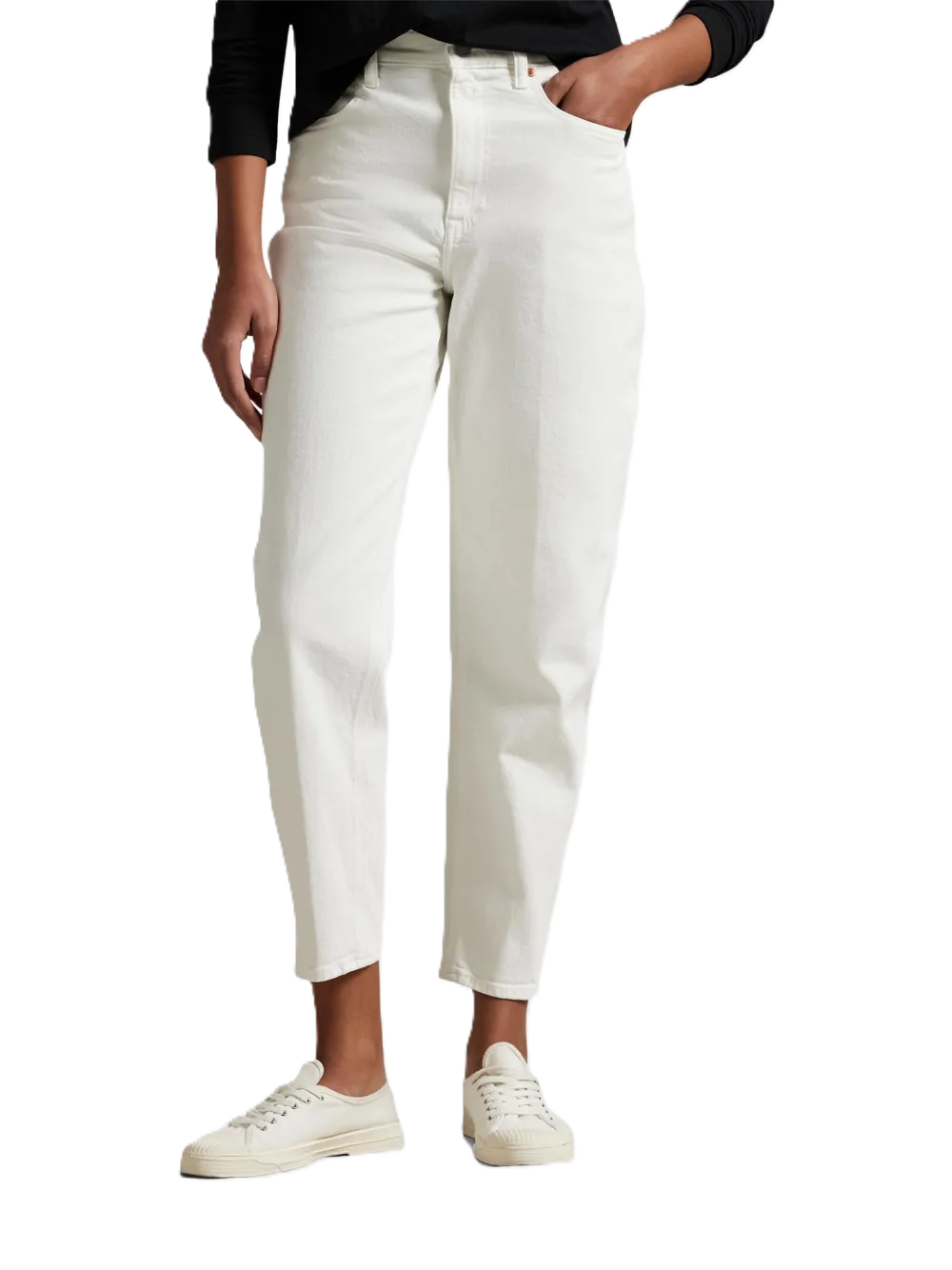 jeans affusolati a vita alta bianchi, design a cinque tasche, patta con bottone e cerniera, passanti per cintura, cuciture tonali