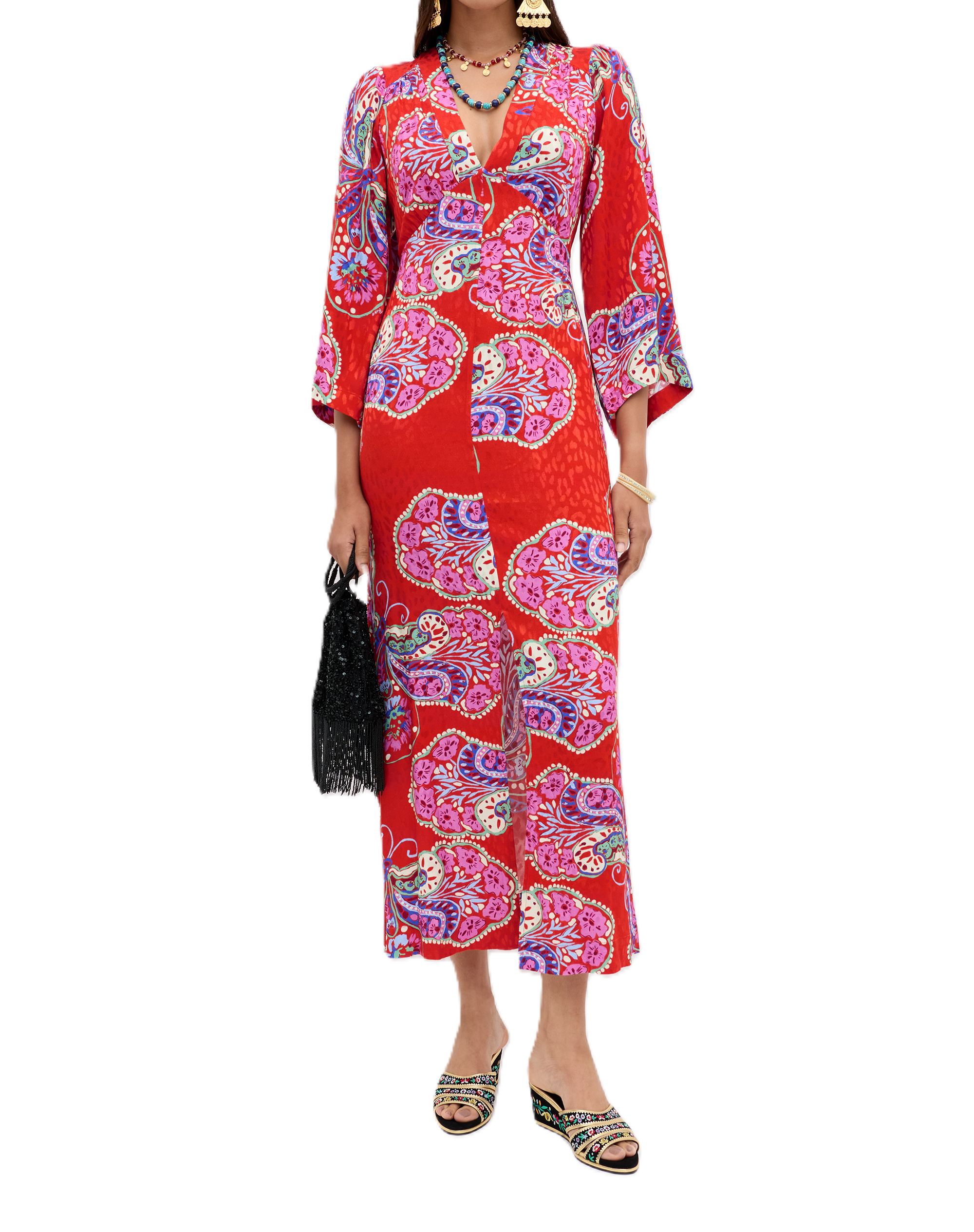 Vestito longuette con maniche ampie e scollatura, in fantasia rosso