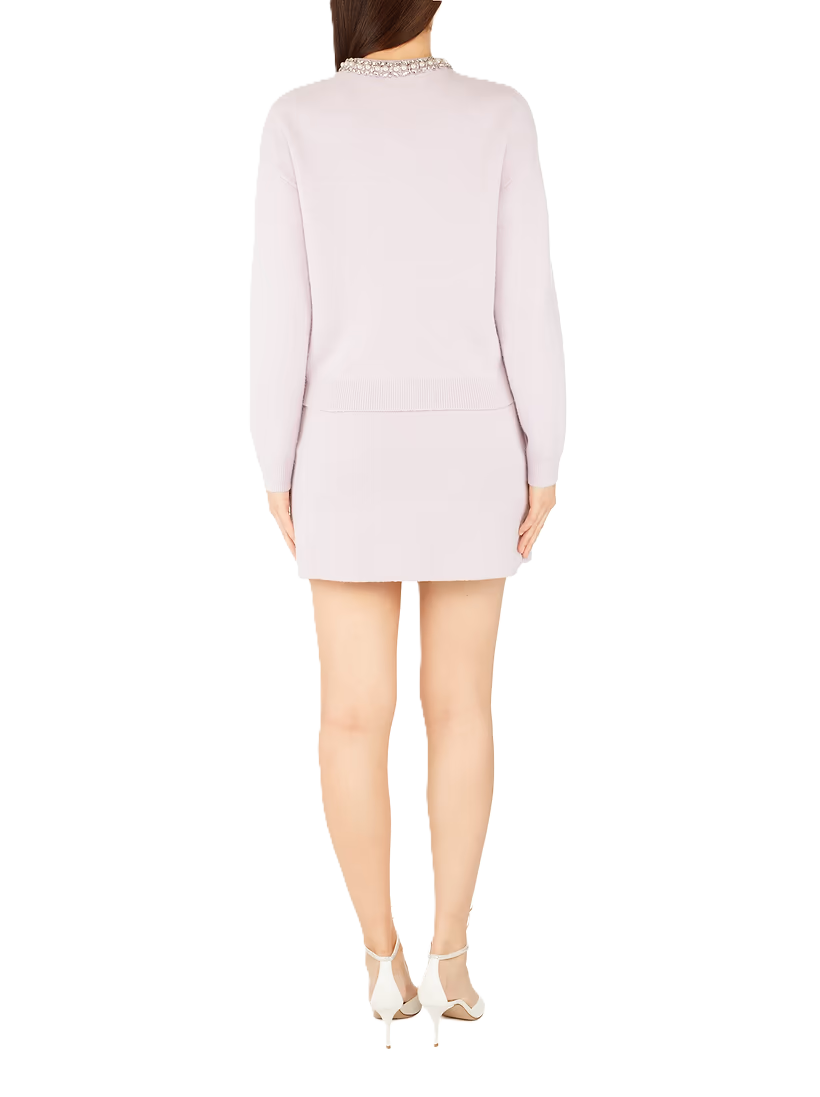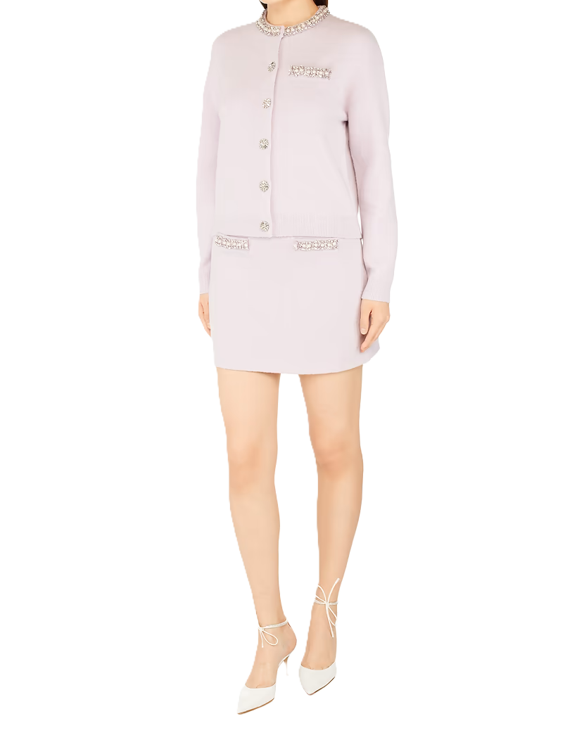 Minigonna a vita media realizzata in un mix di viscosa, lana e alpaca. Elastico in vita a coste, due tasche anteriori a filetto con bottoni automatici, impreziosita da cristalli, perle decorative, paillettes e perline.