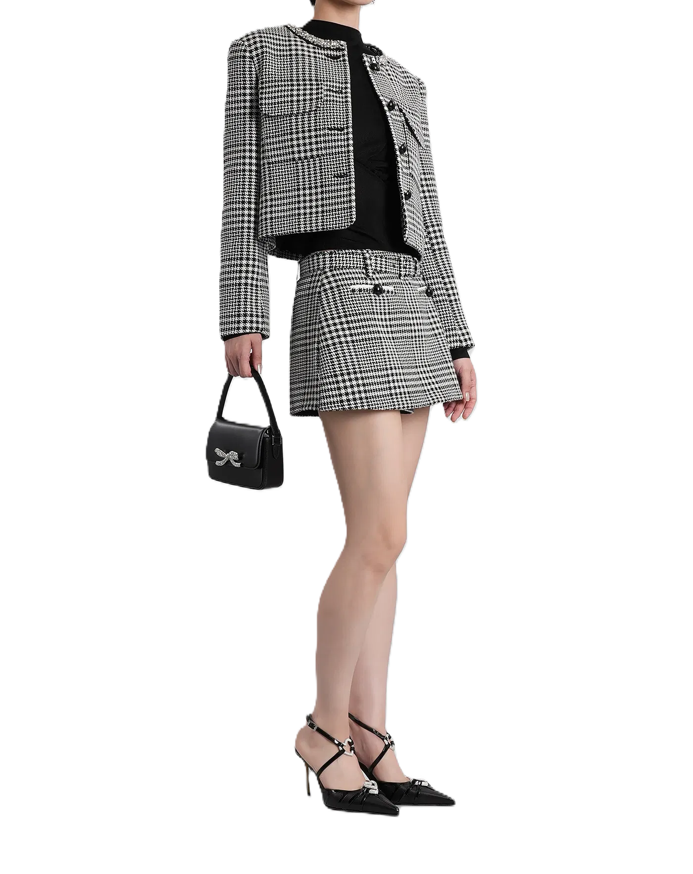 Gli shorts con motivo pied de poule di Self-Portrait conquistano con la loro eleganza senza tempo e la loro sottile stravaganza. Il classico design a vita alta, abbinato a gambe ampie, si abbina armoniosamente all'iconico motivo pied de poule a contrasto bianco e nero, creando un'espressione distintiva di lusso e gusto raffinato.