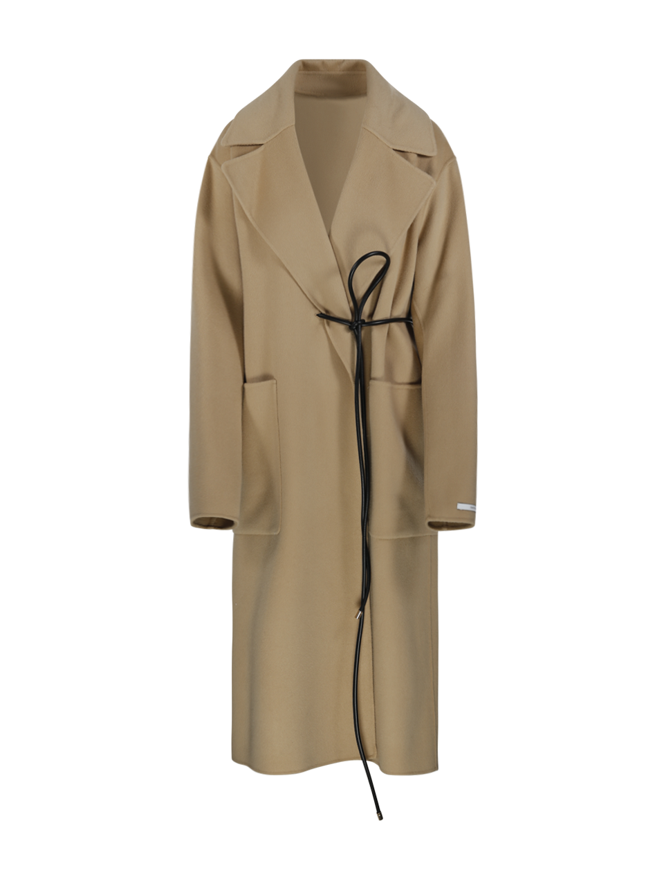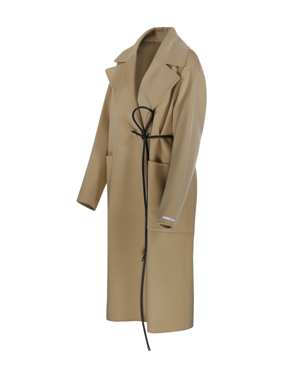 Cappotto abate a vestaglia in double di pura lana. Scollo a rever ampio. Chiusura con cintura tubolare e dettaglio asimmetrico a destra. Grandi tasche laterali applicate. Vestibilità ampia
