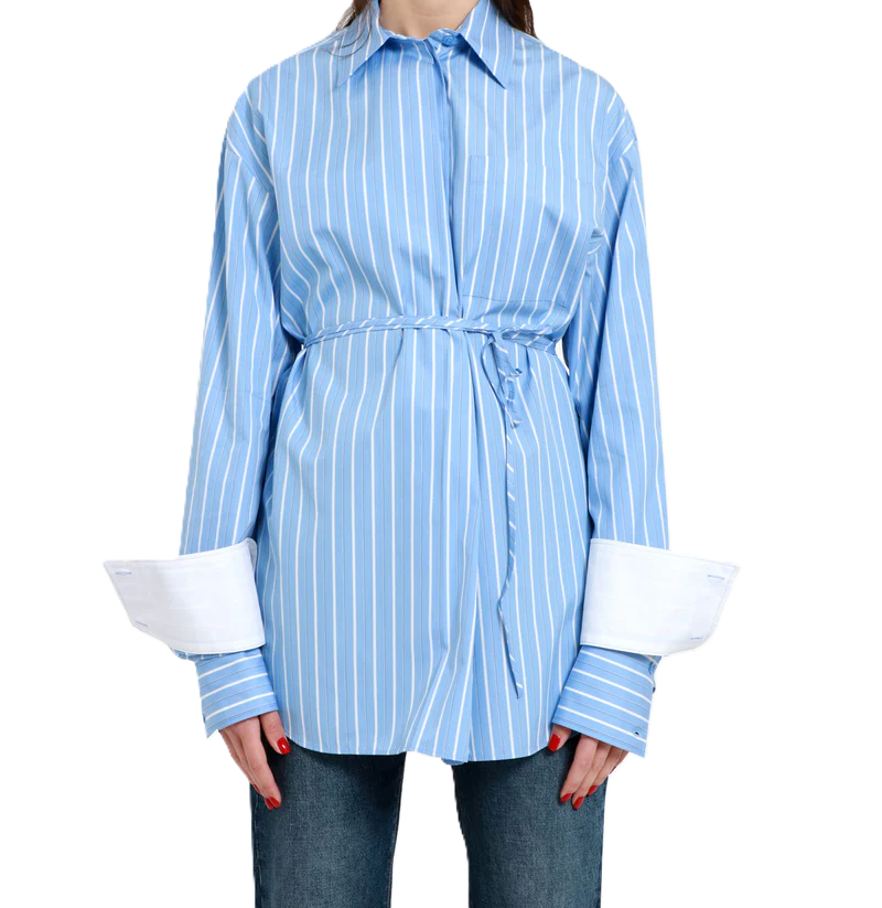 Camicia Sportmax Firma realizzato in cotone con motivo a righe, con spalle scese e impunture al gomito. Design lungo con cintura in tessuto che ne sottolinea il punto vita. Capo versatile per un abbigliamento casual e più formale.