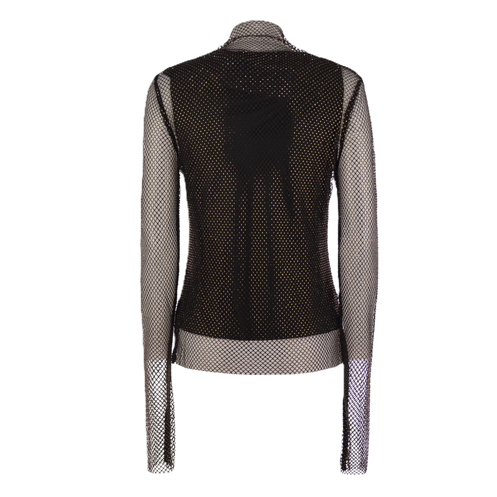 T-shirt a maniche lunghe realizzata in rete tecnica con strass applicati. Il collo rialzato a cratere crea un delicato drappeggio, che si riflette anche sul fondo del capo. Modello foderato con canotta in jersey.